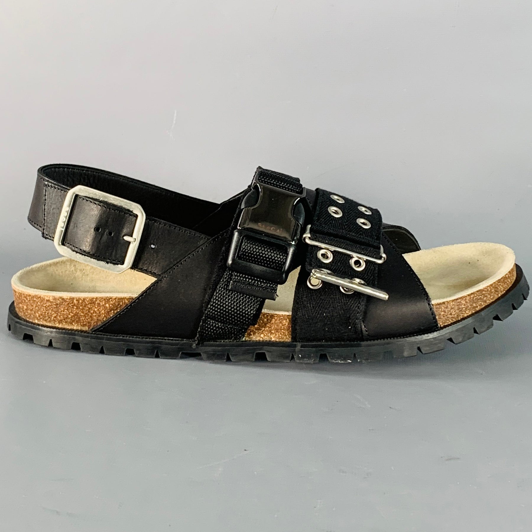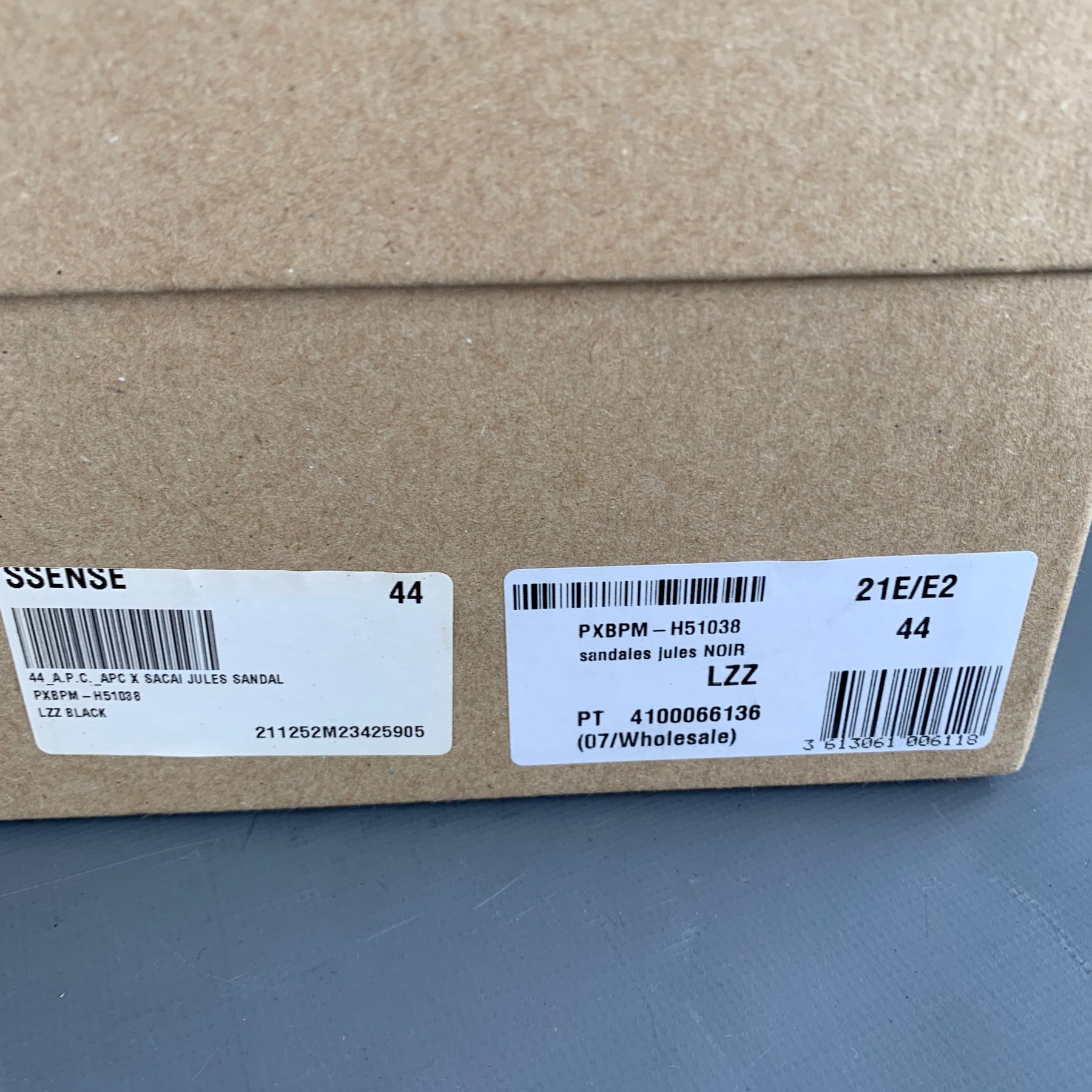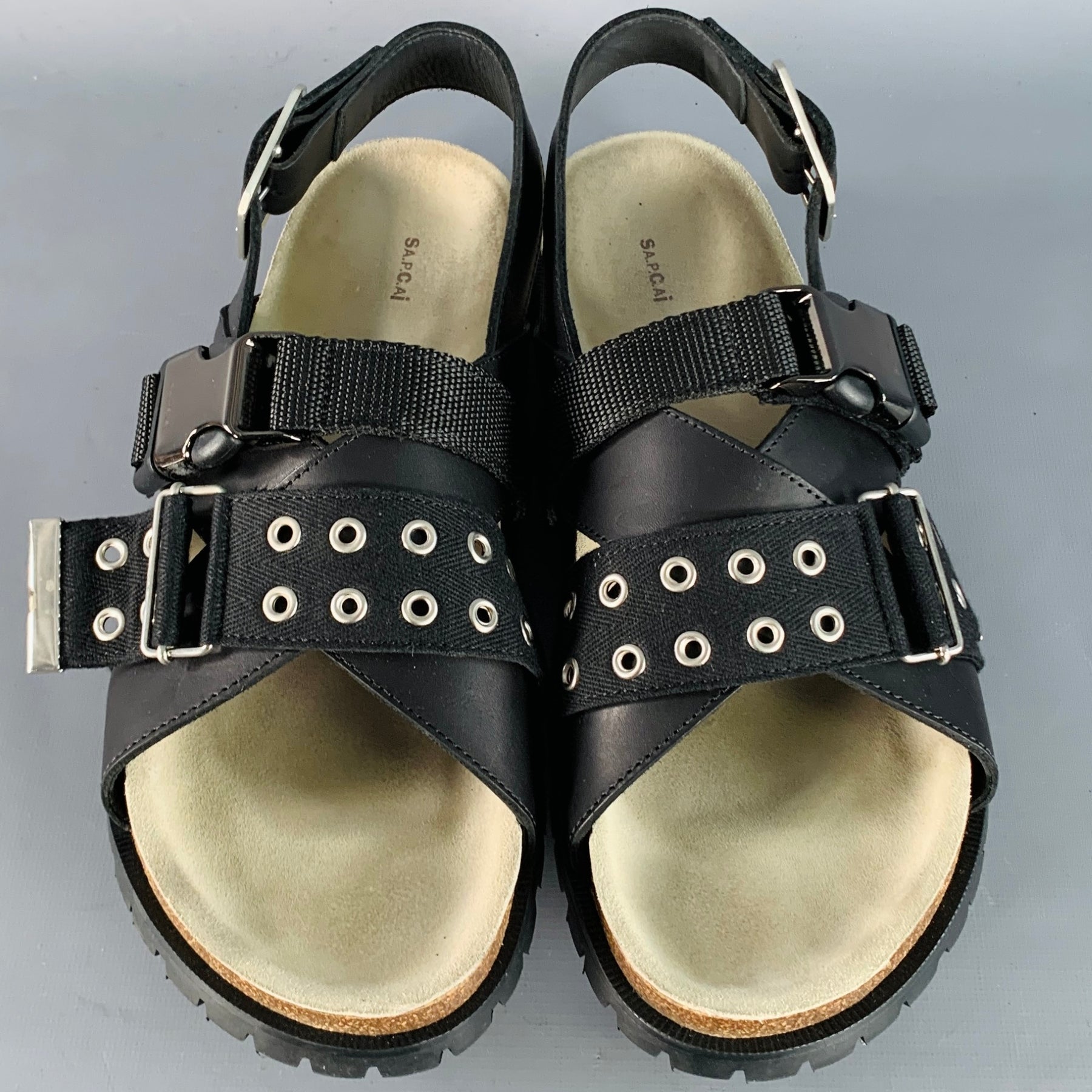 A.P.C. x SACAI "Jules" sandals in a black leather featuring a strappy style, canvas straps with silver tone metal grommets, and buckle closure. Comes with box. Made in Portugal.