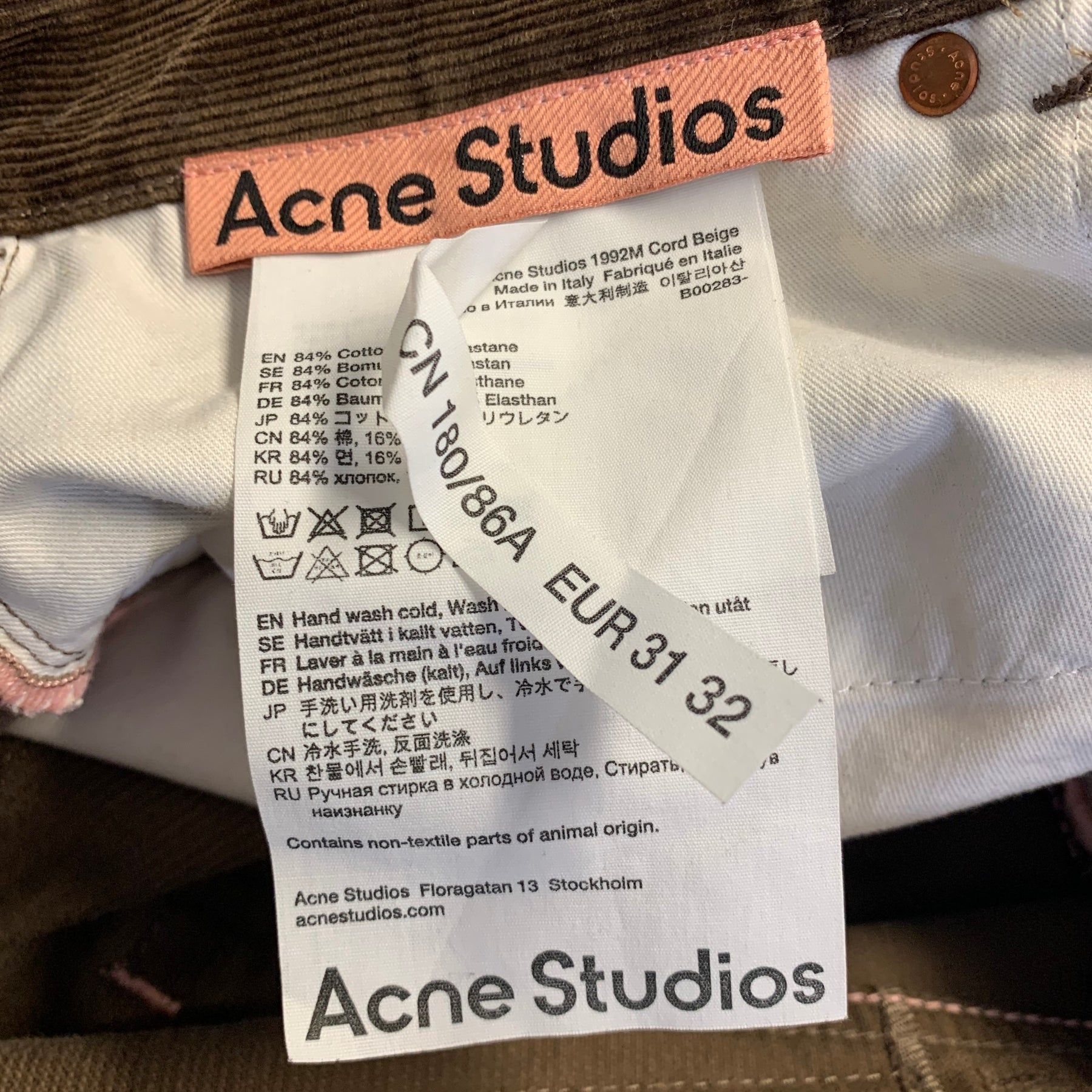 Acne Studios corduroy pants. Made in Italy from a comfortable cotton-elastane blend, these brown, jean-cut trousers offer a timeless style. Made in Italy.