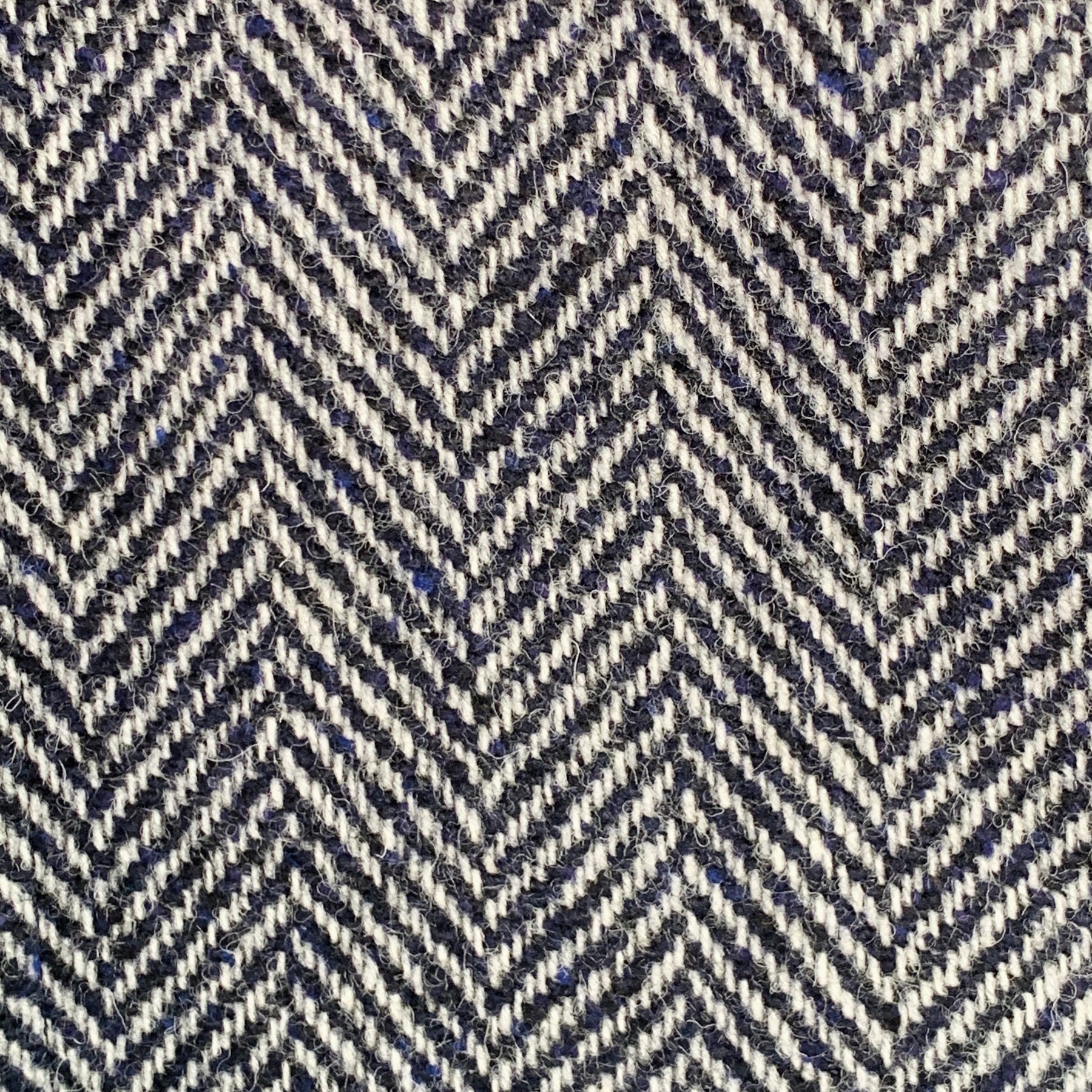 ALEX MILL coat in a grey and navy wool blend fabric featuring a herringbone pattern, long sleeves, and hidden button closure.