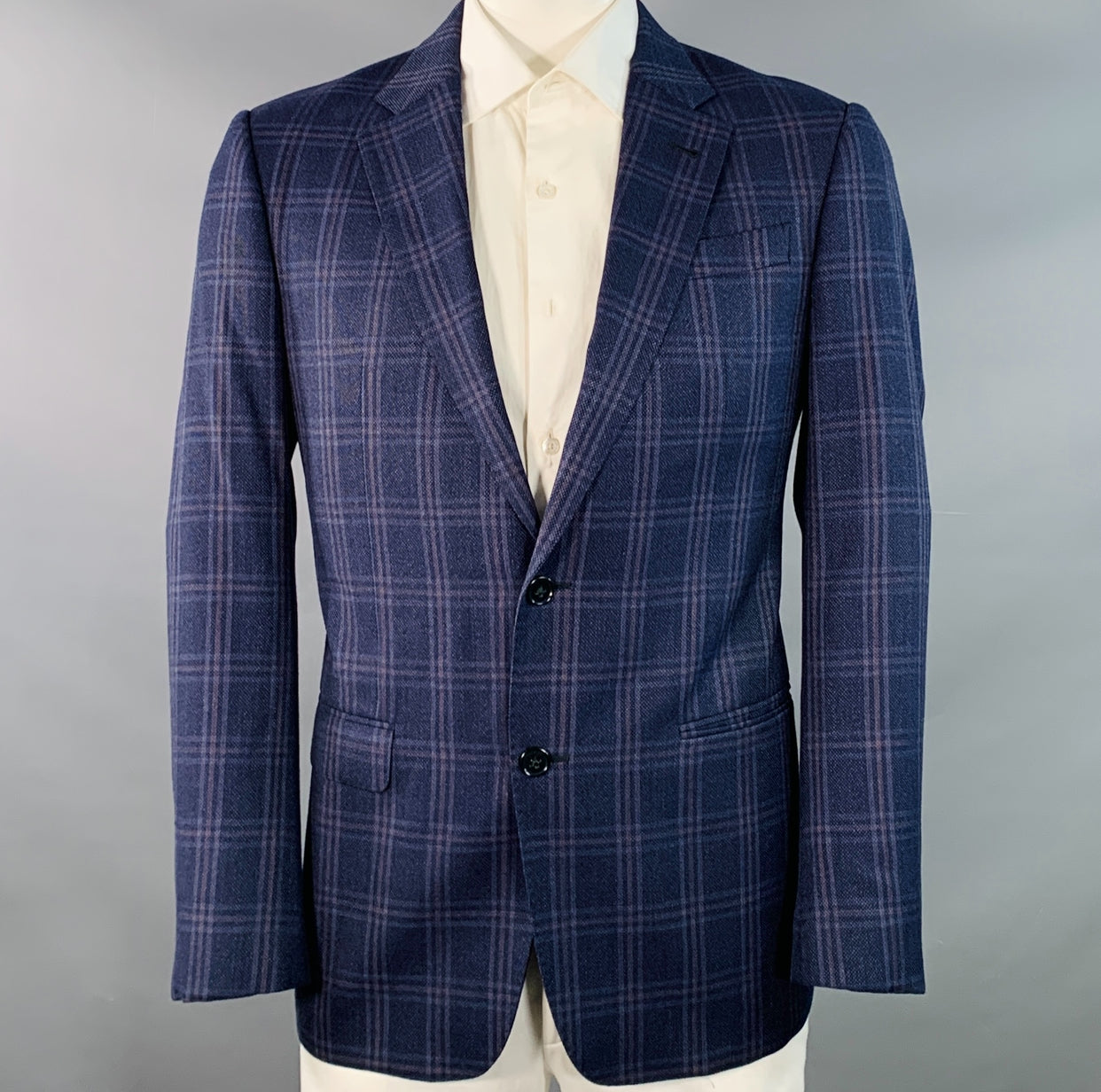 ARMANI COLLEZIONI Size 44 Navy Blue Brown Plaid Virgin Wool Notch Lapel Sport Coat