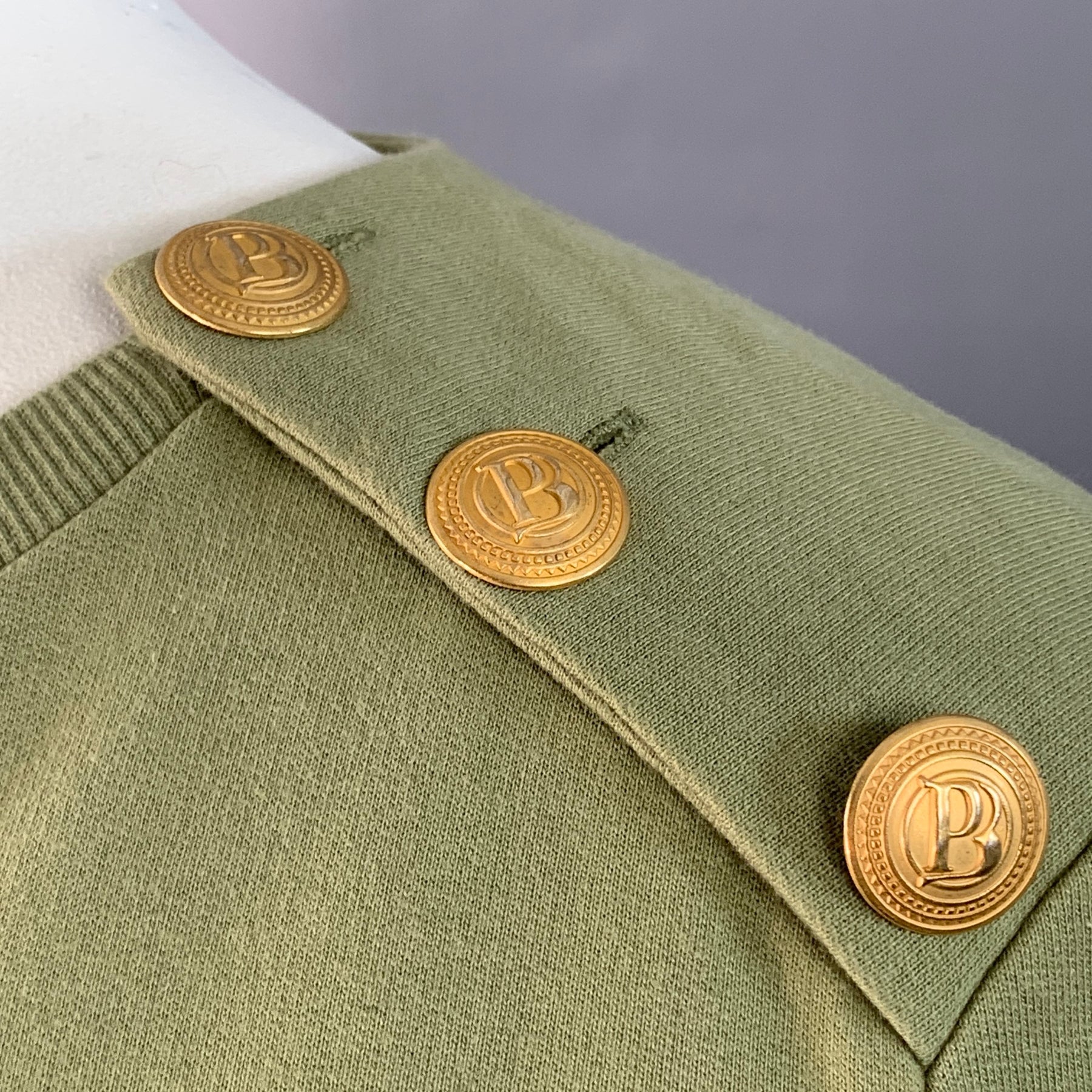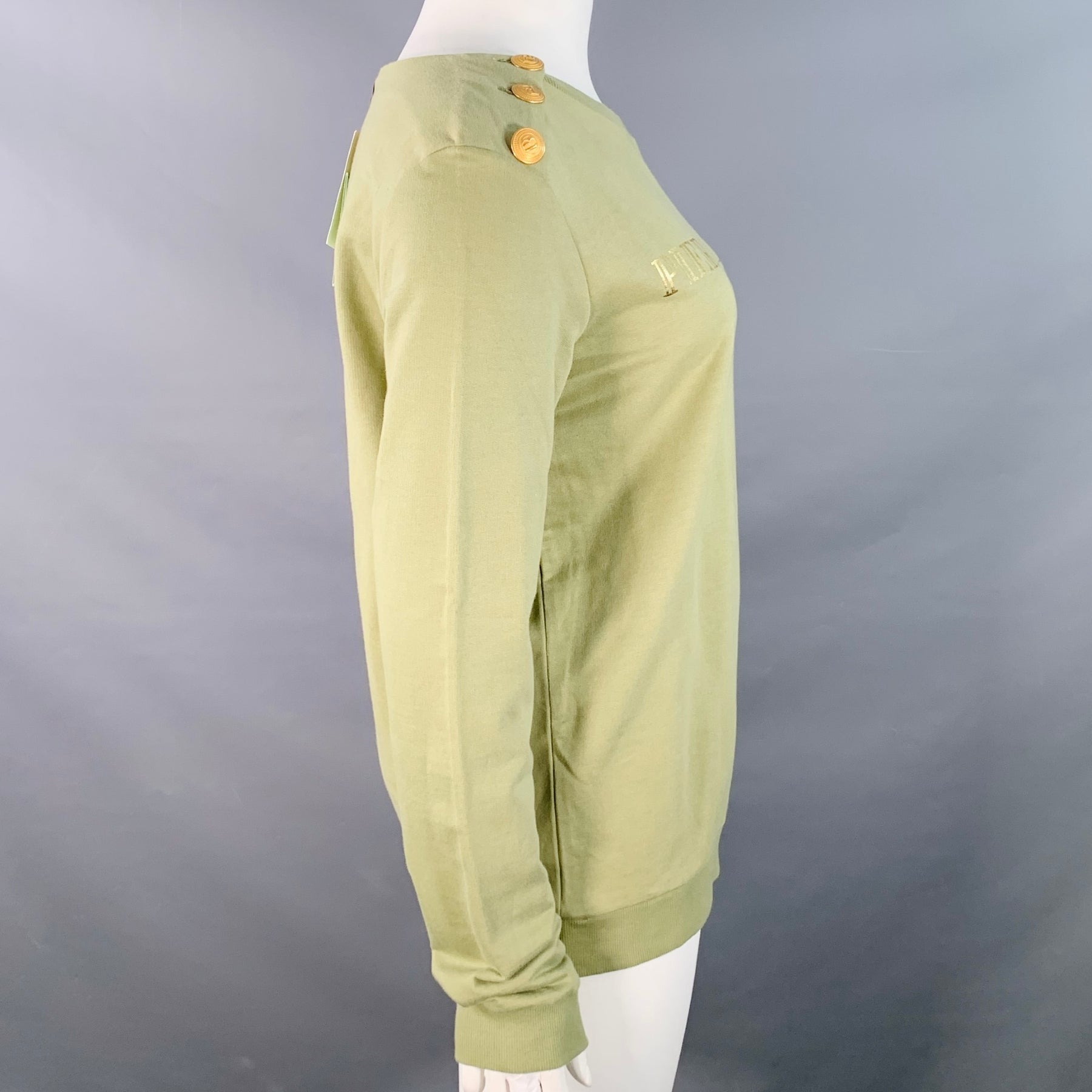 BALMAIN sweatshirt in a sage green cotton stretch blend jersey featuring a metallic gold tone logo print, matching gold tone monogram shoulder button details, and crew neck.