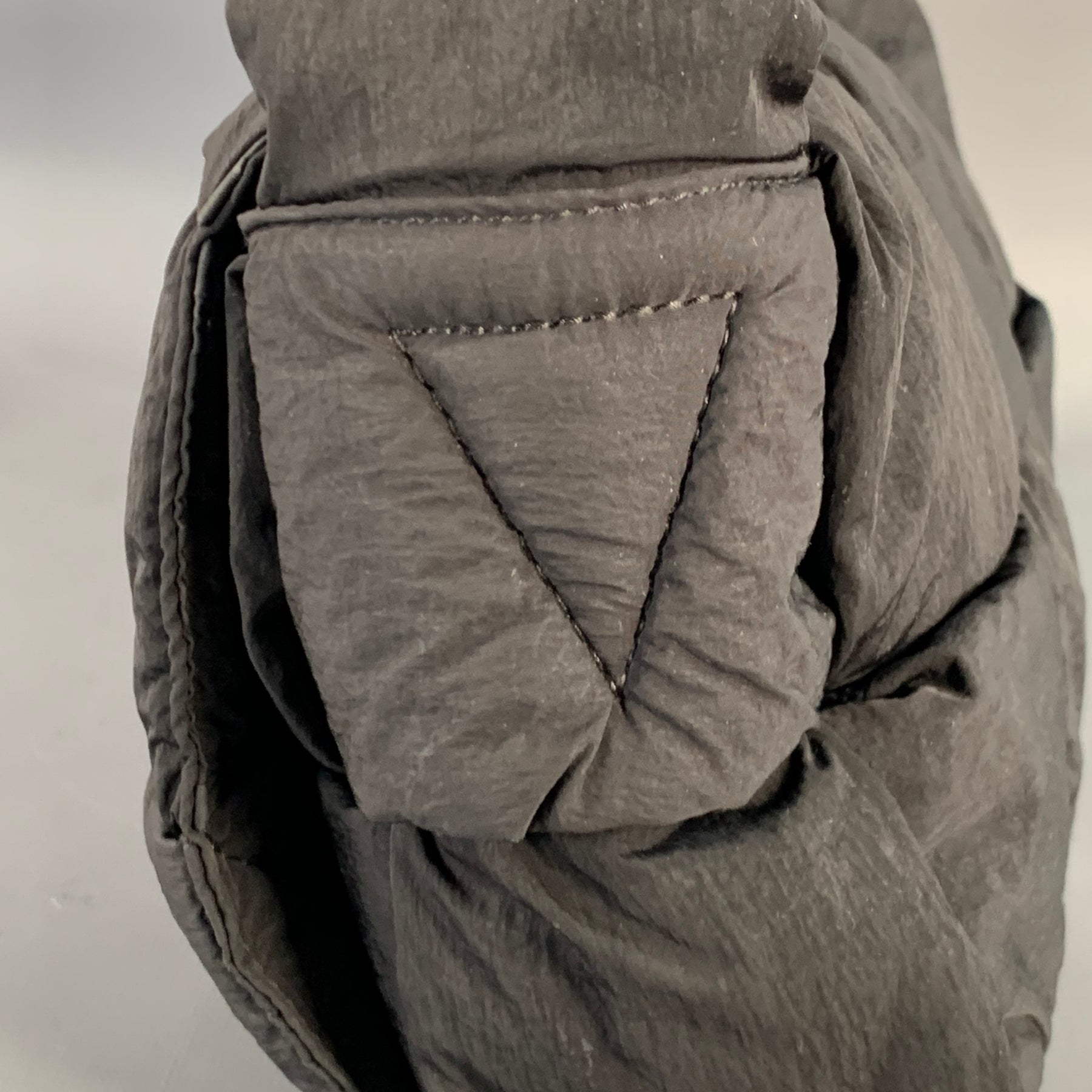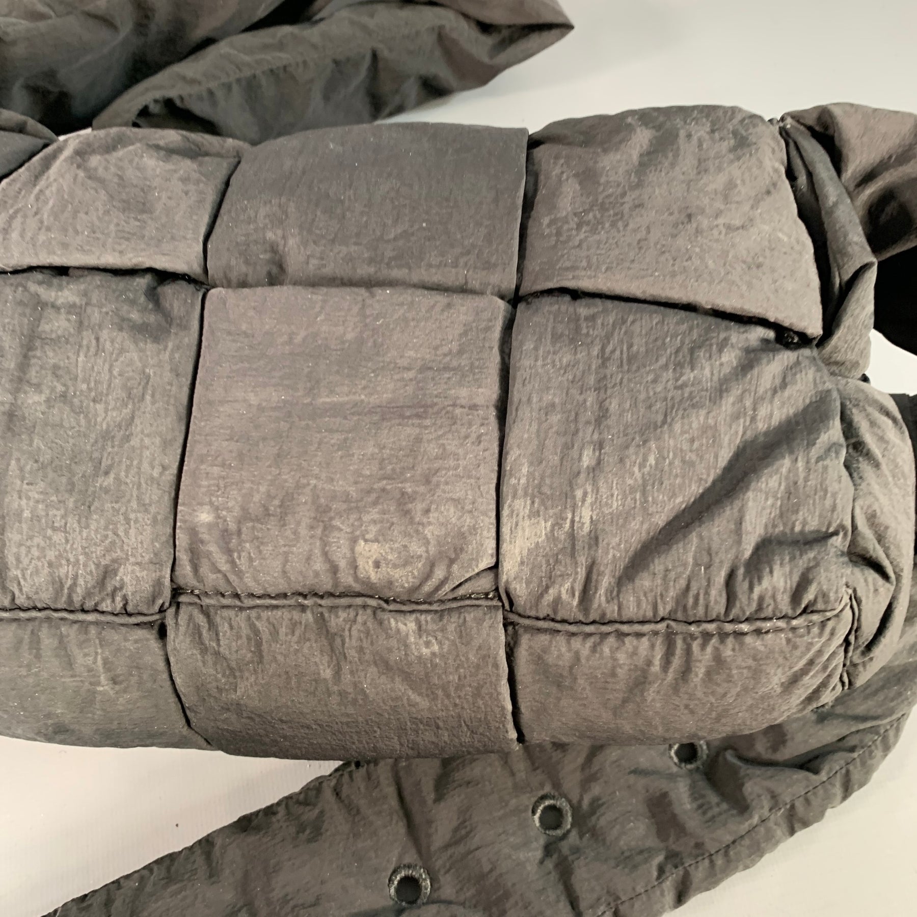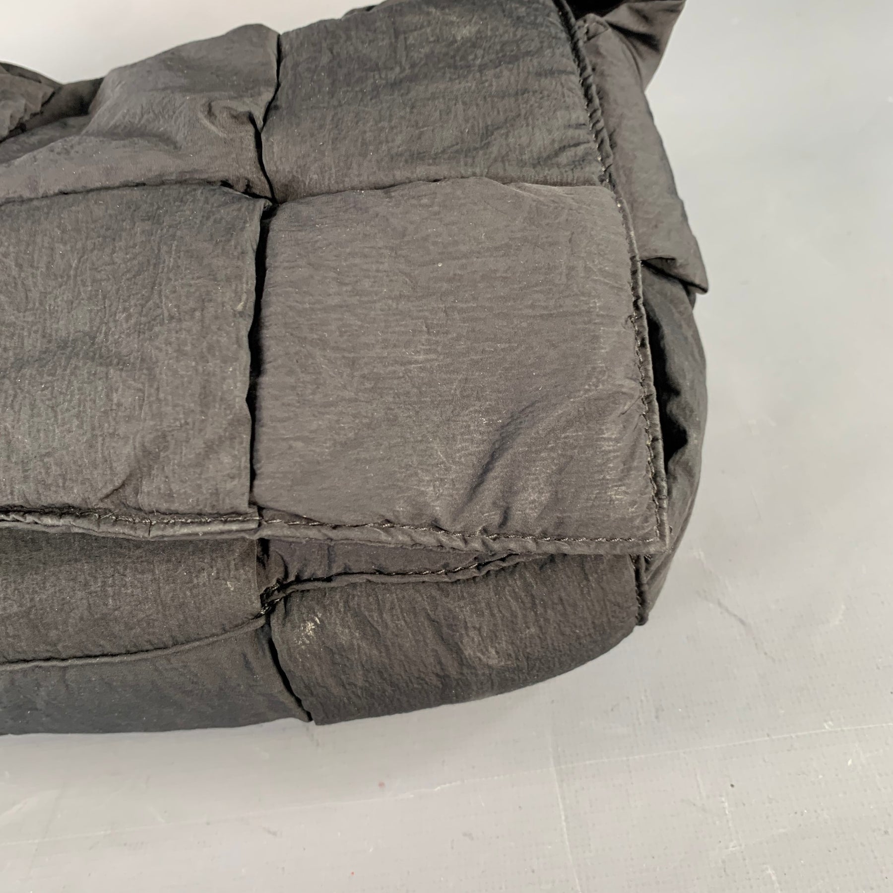 BOTTEGA VENETA "Padded Tech Cassette" handbag in a black nylon fabric featuring signature woven design, adjustable shoulder strap, detachable inner pouch, and flap closure with magnets.