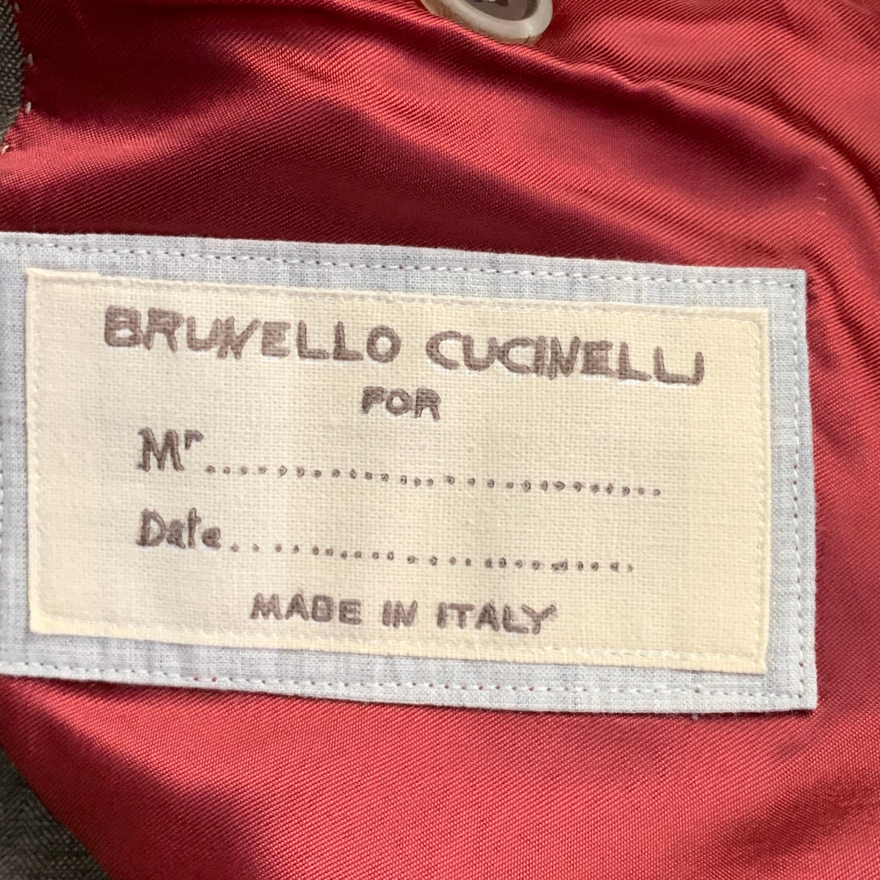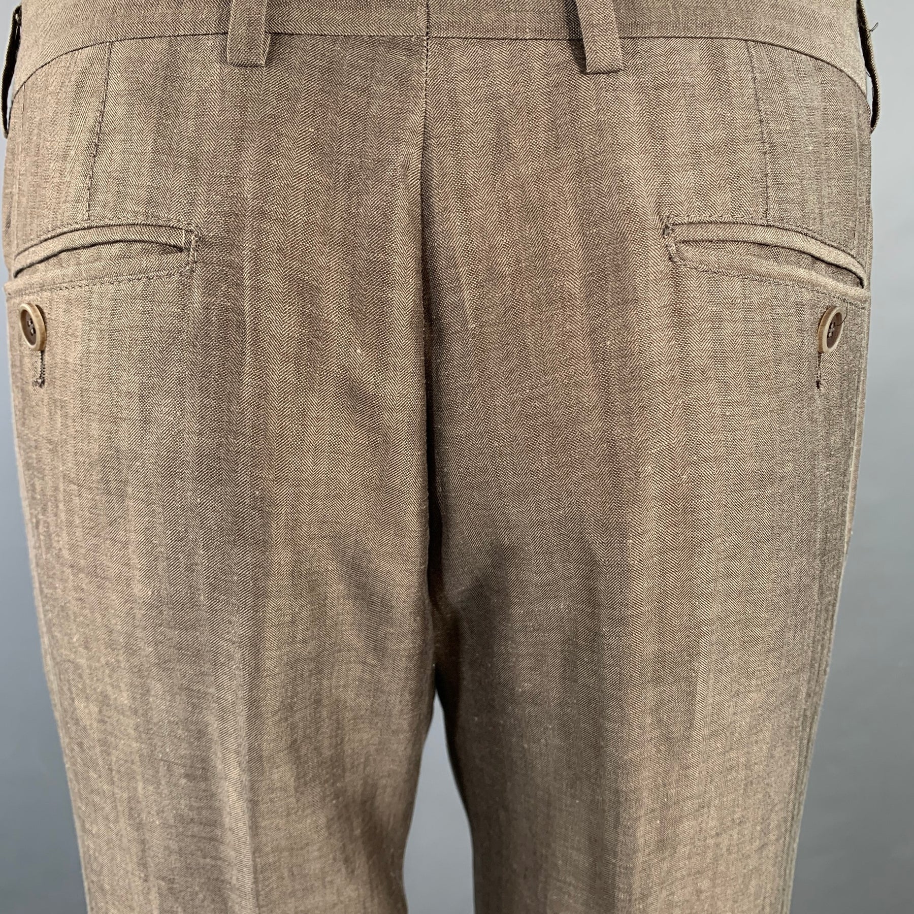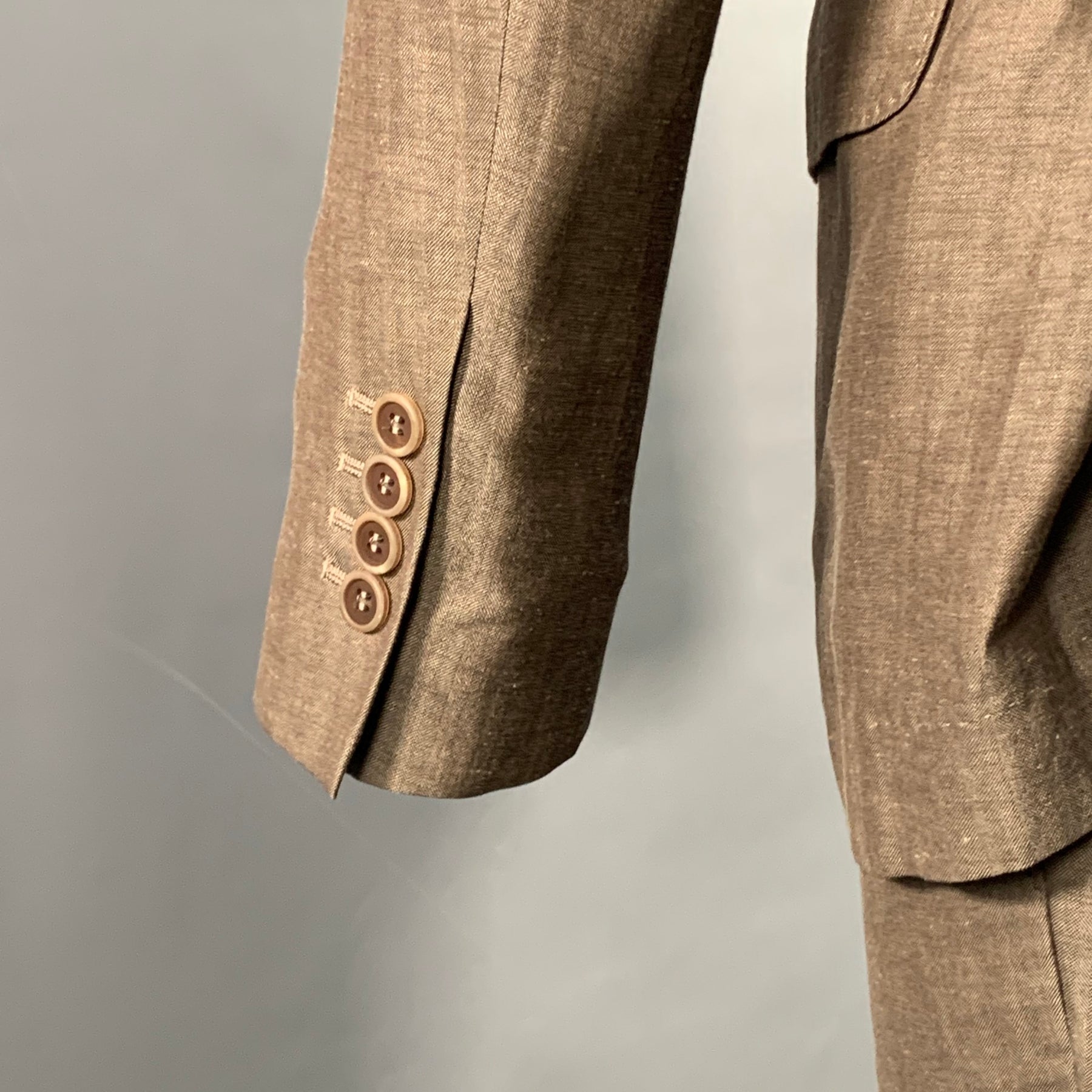 BRUNELLO CUCINELLI suit in a brown herringbone linen wool silk blend fabric with a half liner and includes a single breasted, three button sport coat with a peak lapel and matching flat front trousers. Note: this garment has been professionally altered and the trouser cuffs are slightly uneven in length. Please double check measurements.Made in Italy.
