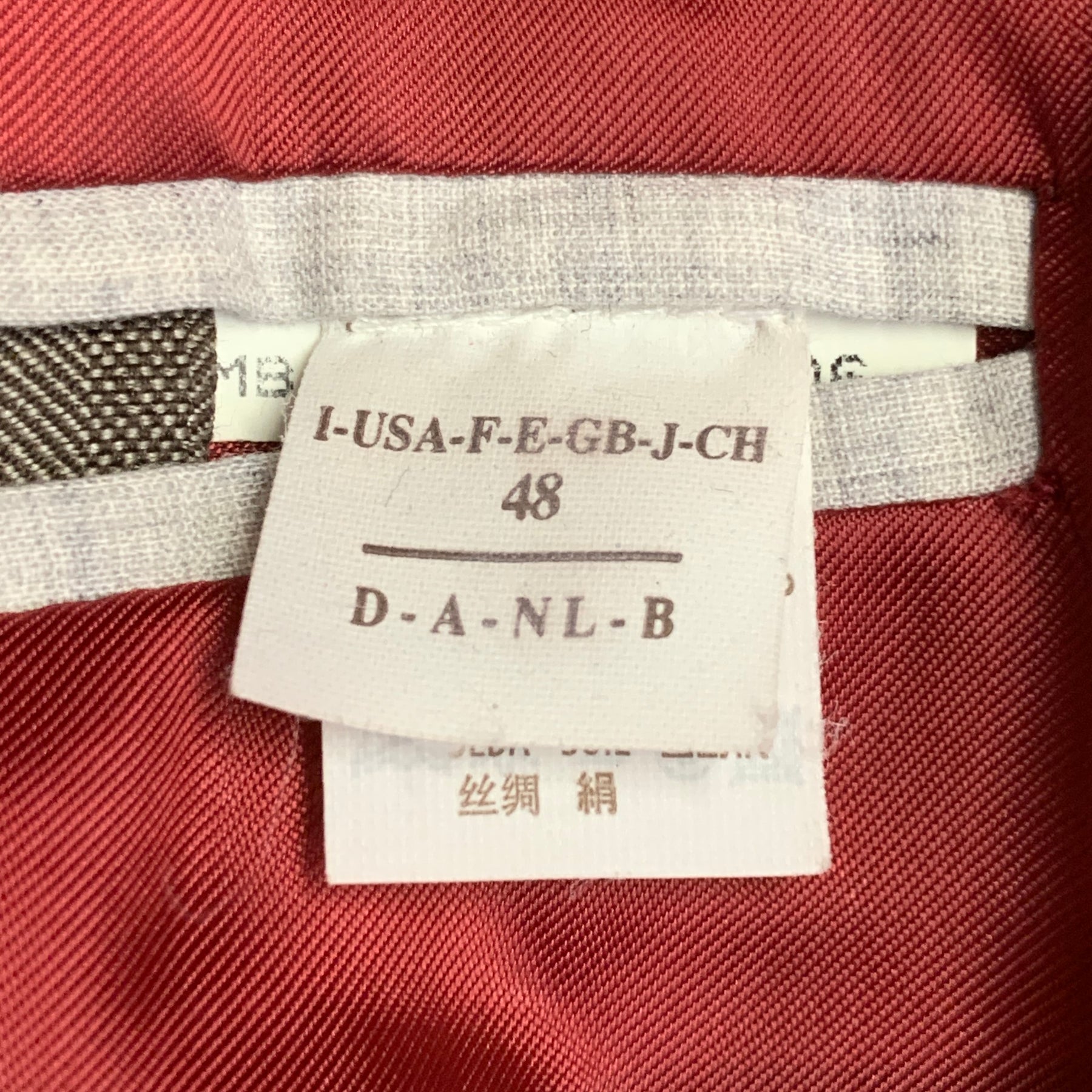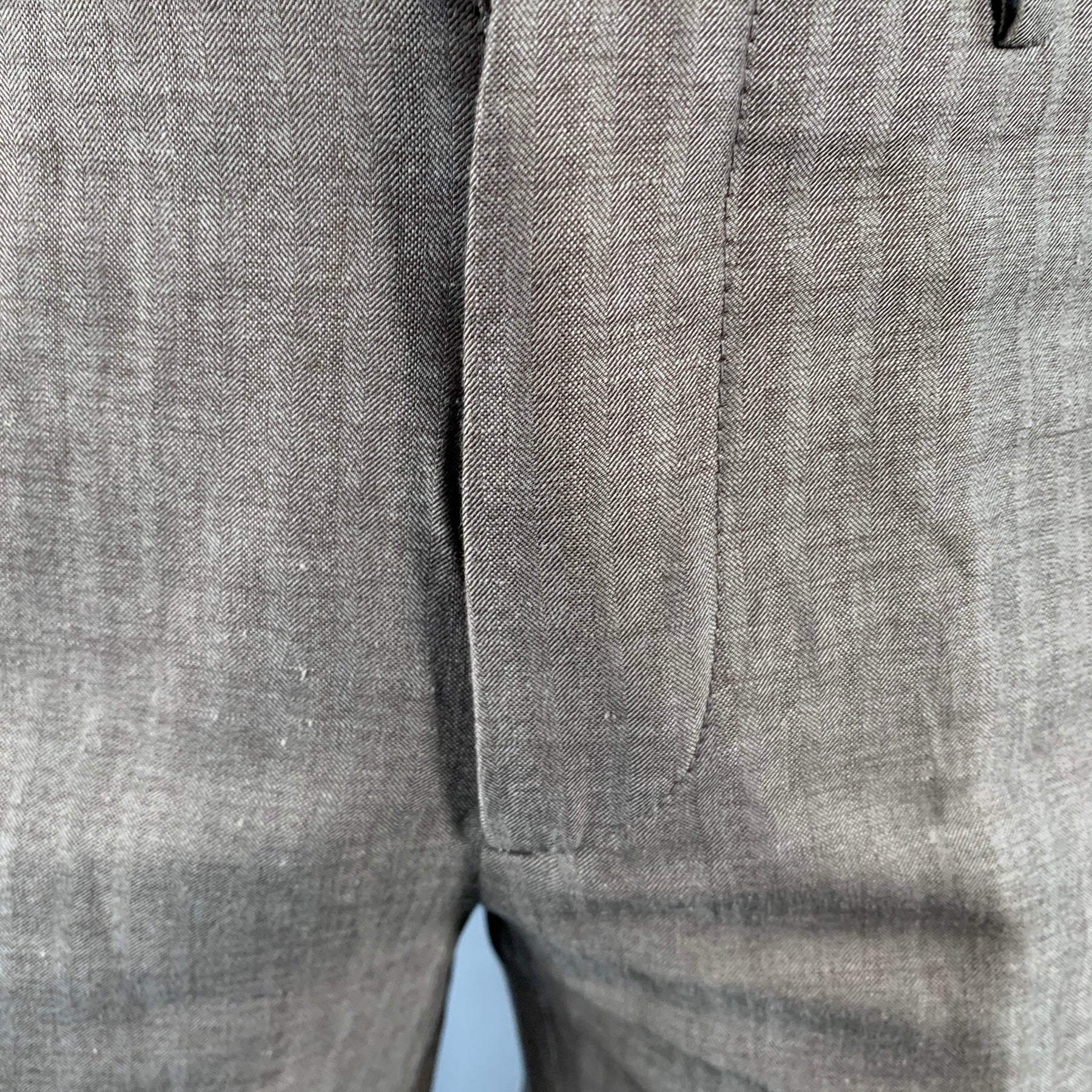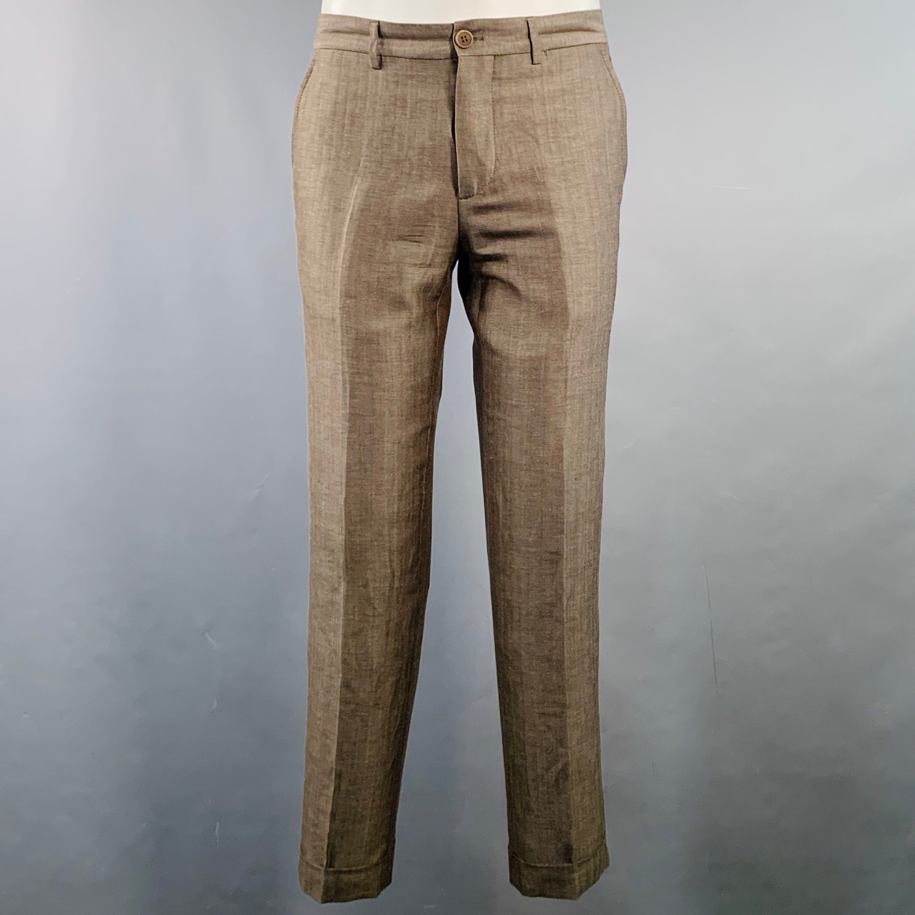 BRUNELLO CUCINELLI suit in a brown herringbone linen wool silk blend fabric with a half liner and includes a single breasted, three button sport coat with a peak lapel and matching flat front trousers. Note: this garment has been professionally altered and the trouser cuffs are slightly uneven in length. Please double check measurements.Made in Italy.
