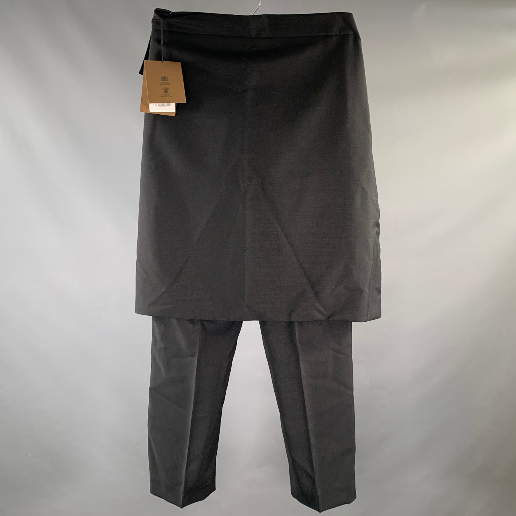 Burberry dress pants are expertly tailored in Italy from a premium mohair and wool blend. Featuring a sleek black finish, a functional zip fly, and an attached back panel, they offer a sophisticated fit for any formal occasion.