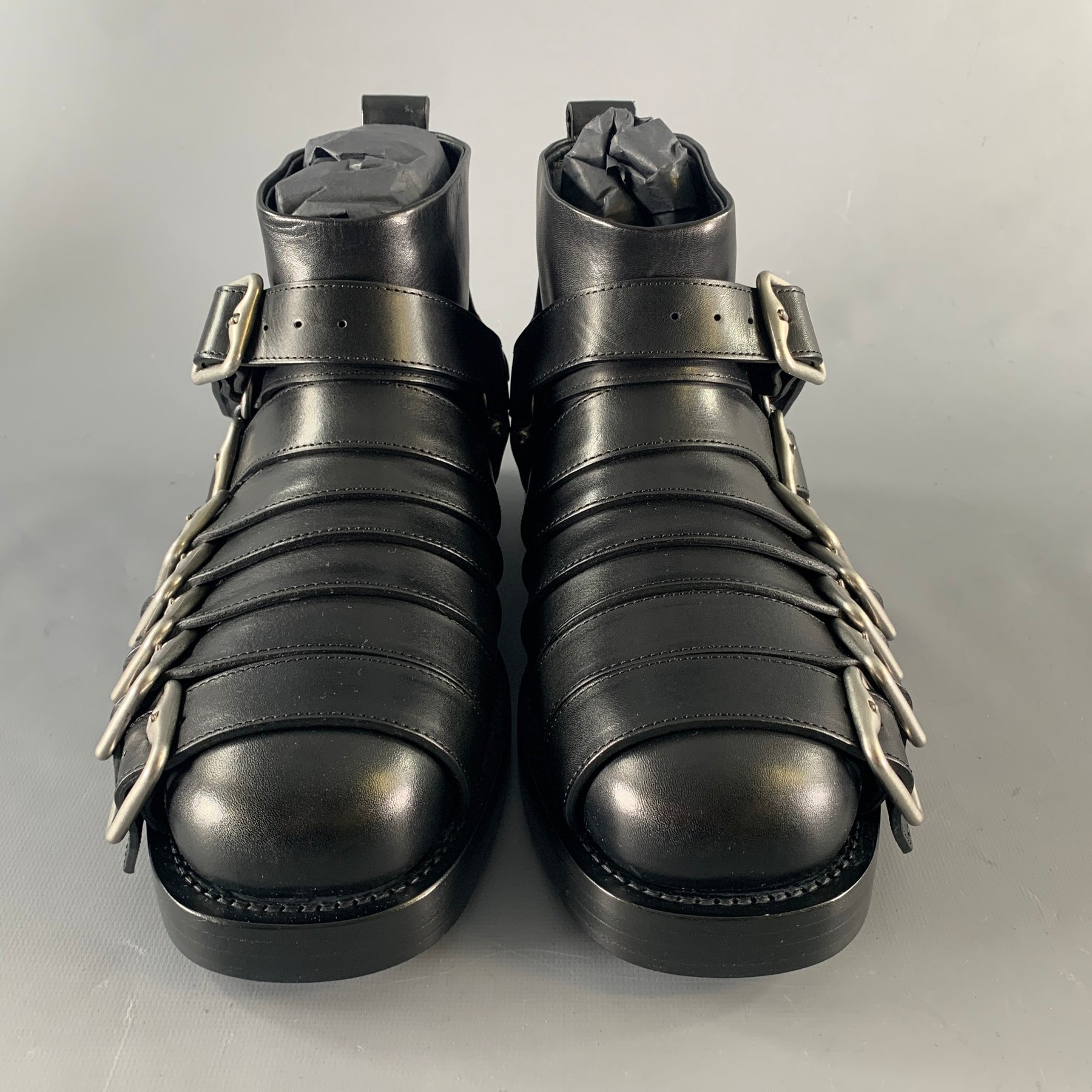 Burberry ankle boots for men feature a sleek black leather construction and a modern pull-on design. Highlighting a unique multi-belt aesthetic. Made in Italy.