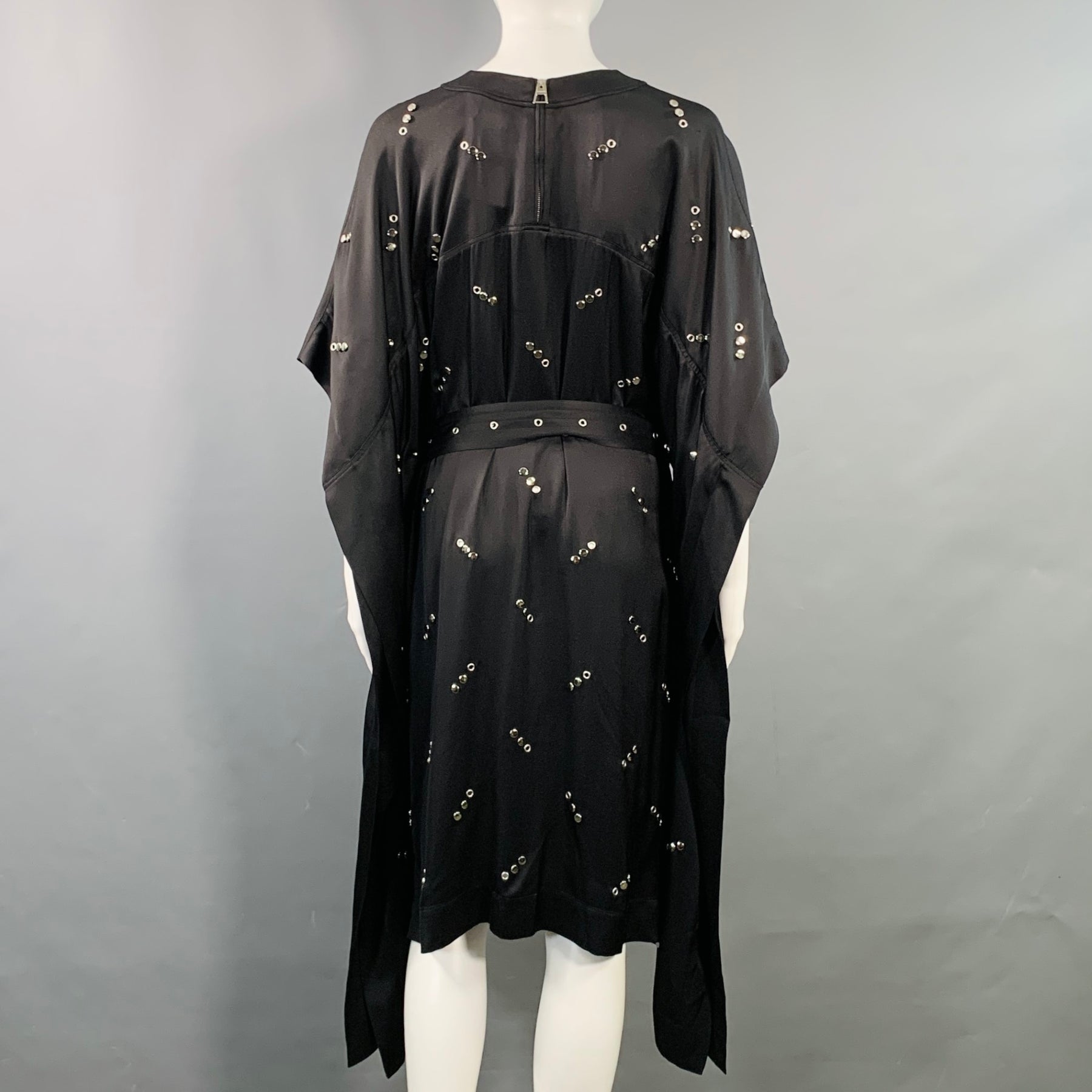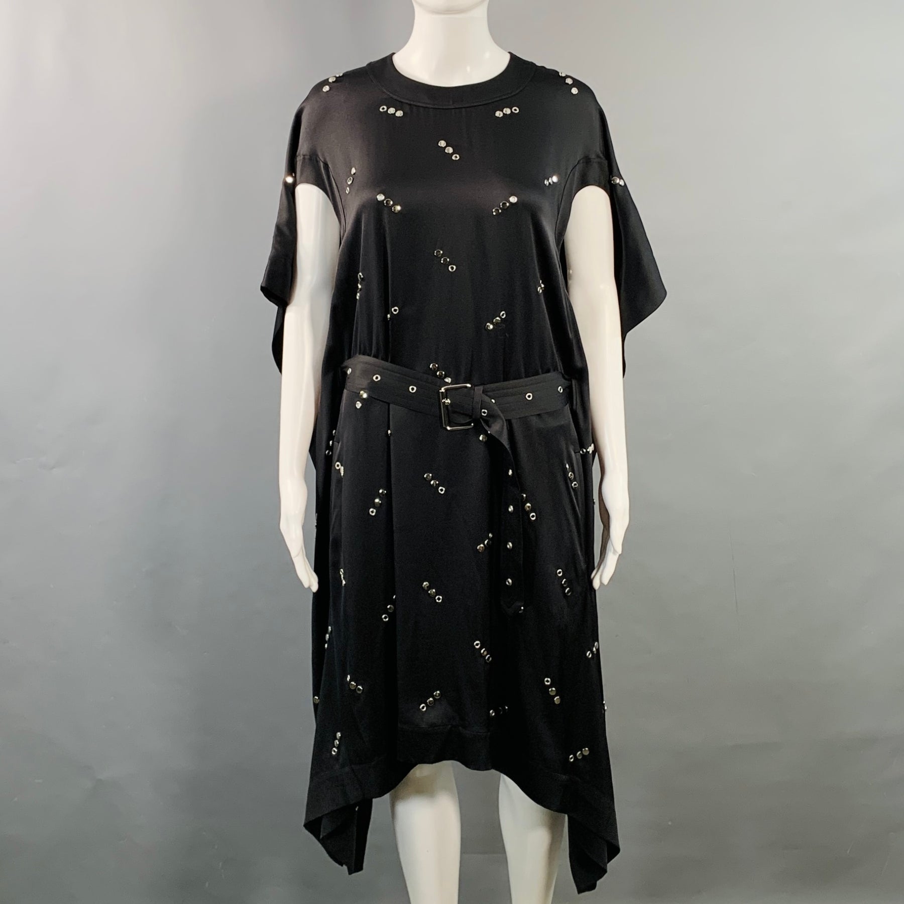 BURBERRY dress in a black silk featuring a cape style, asymmetrical hem, all over studded design, and belt closure.