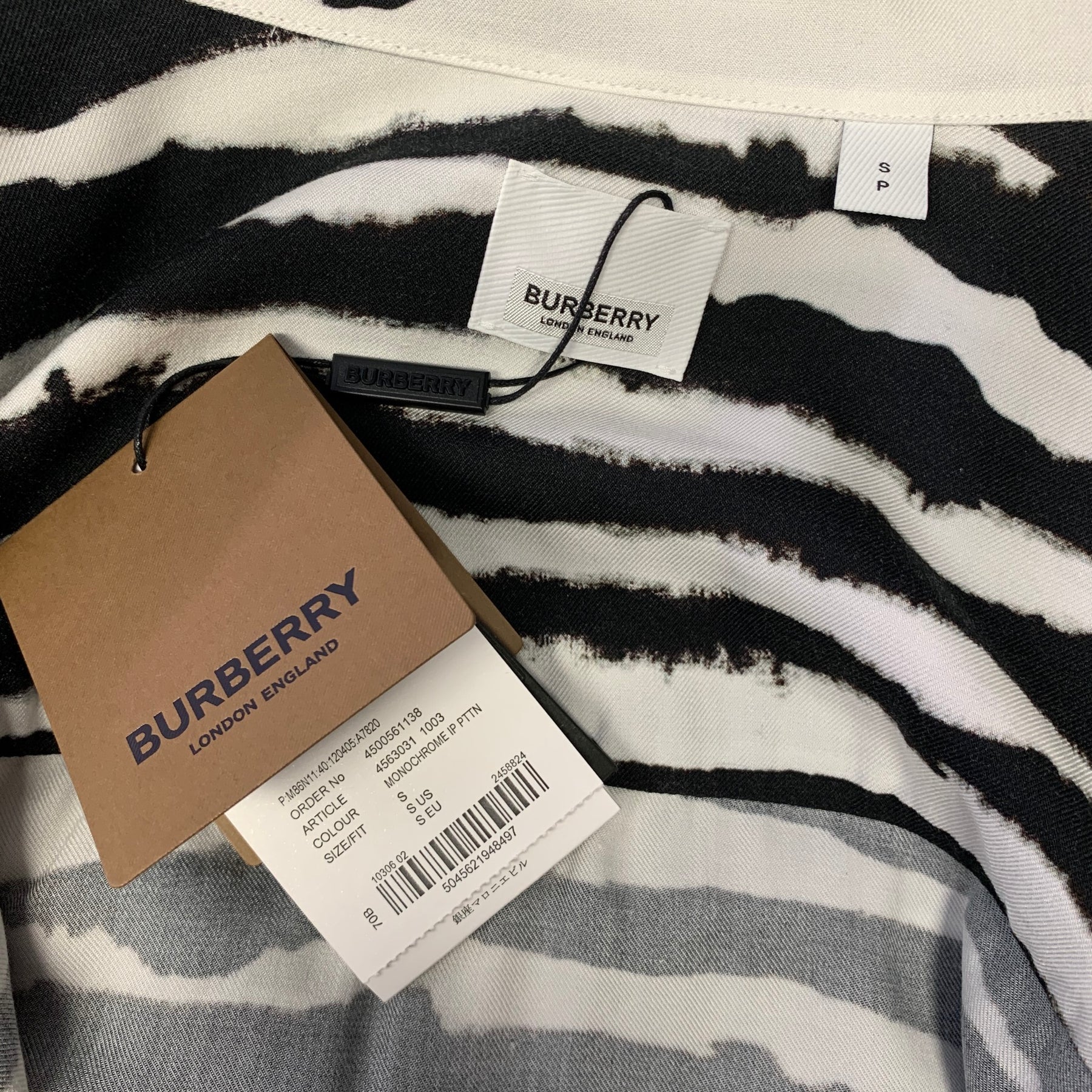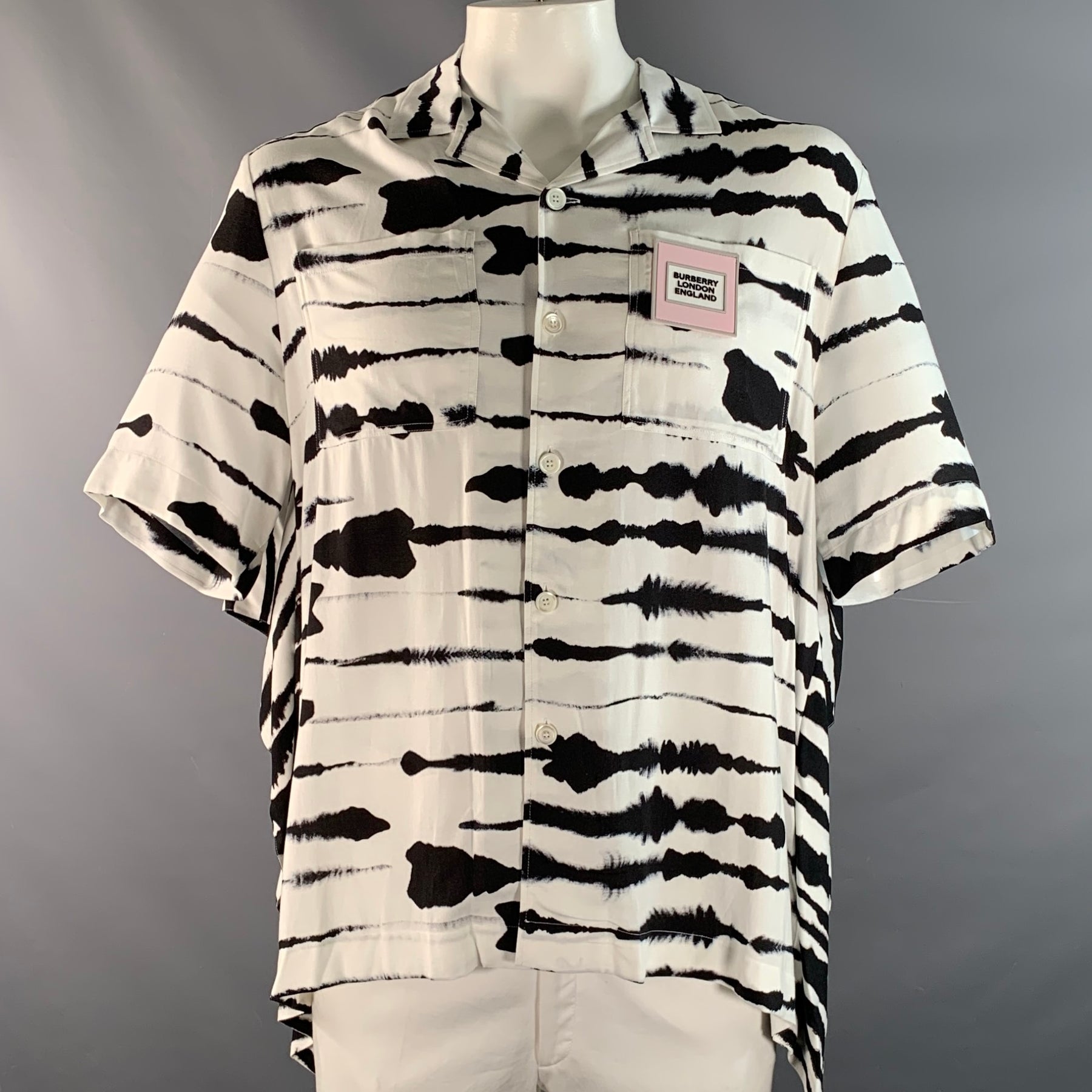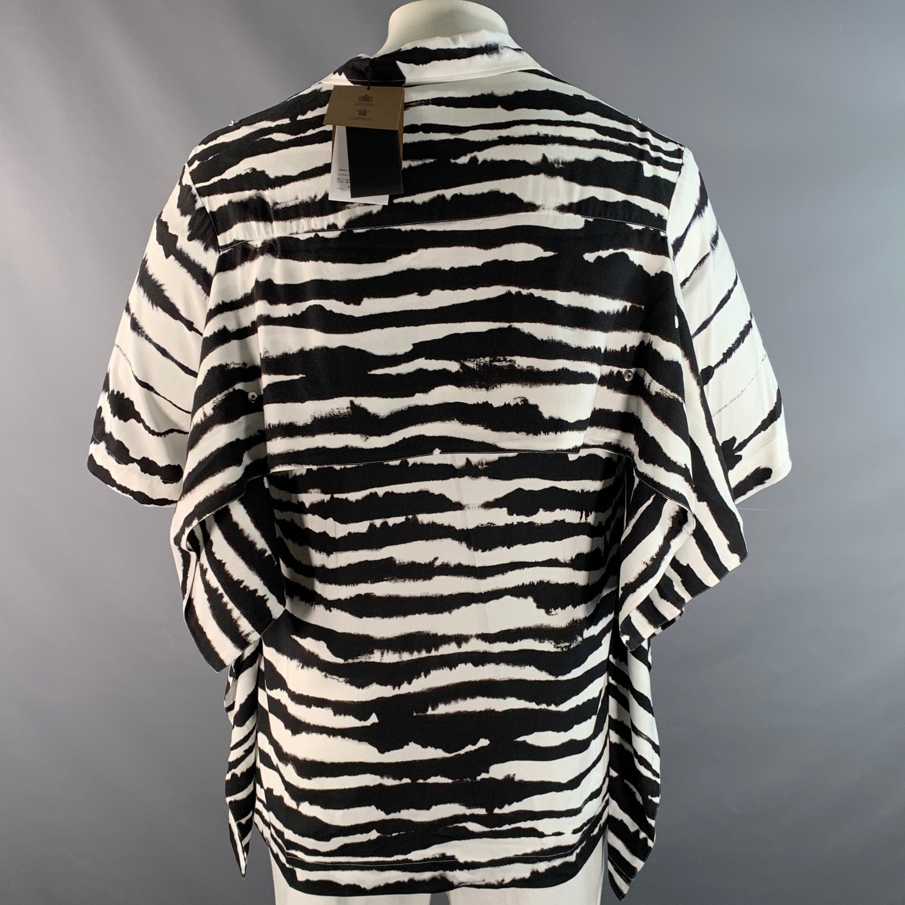 Burberry short sleeve shirt is a standout piece for the modern wardrobe, featuring a bold black and white print and a attached back panel. Designed for adult men in a size Small, it is crafted from lightweight viscose for a smooth, breathable feel. The design is accented with functional patch pockets, offering a contemporary edge to a classic silhouette.