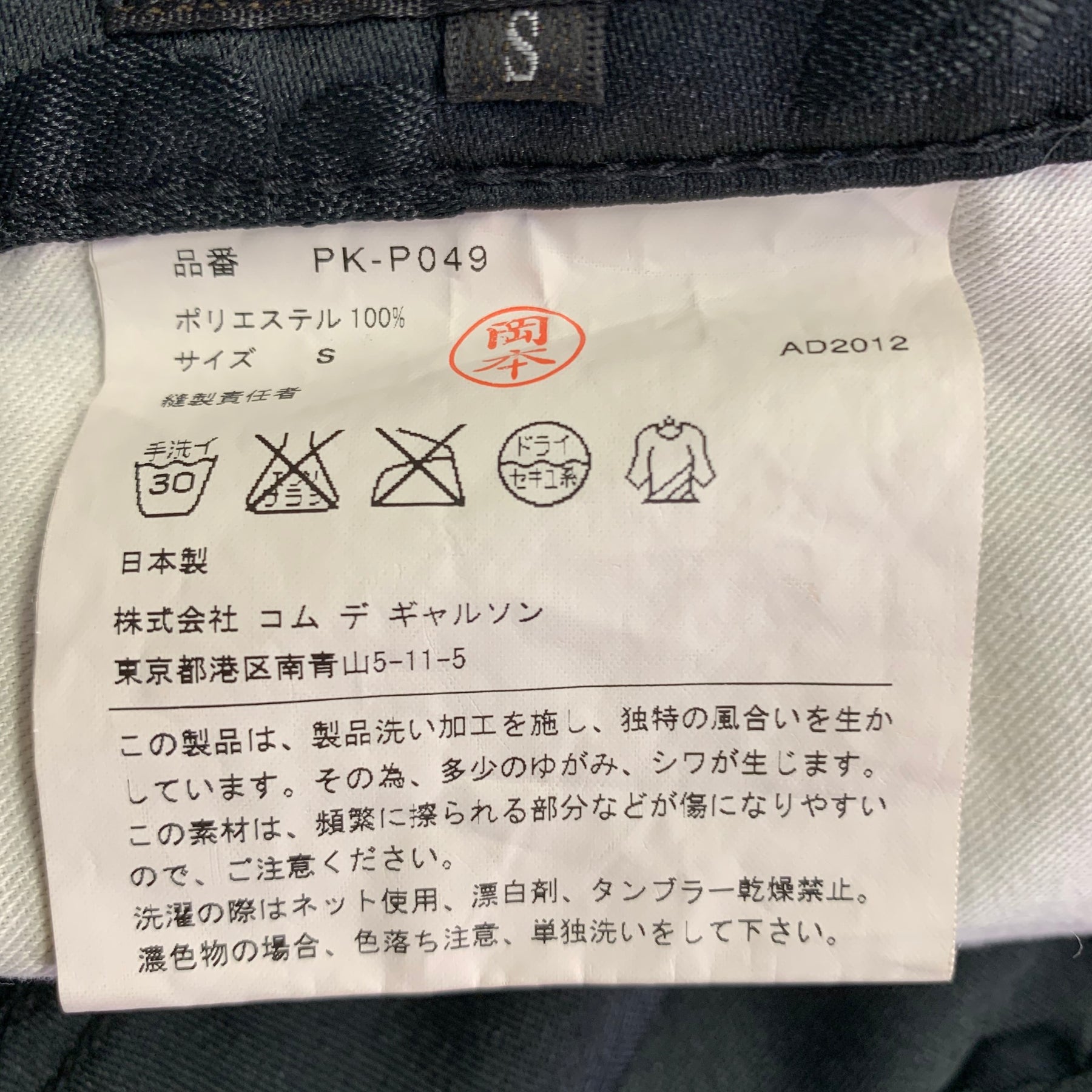 COMME des GARCONS casual pants in a black polyester satin featuring a floral patterned jacquard, tapered leg, and zip fly closure. Made in Japan.