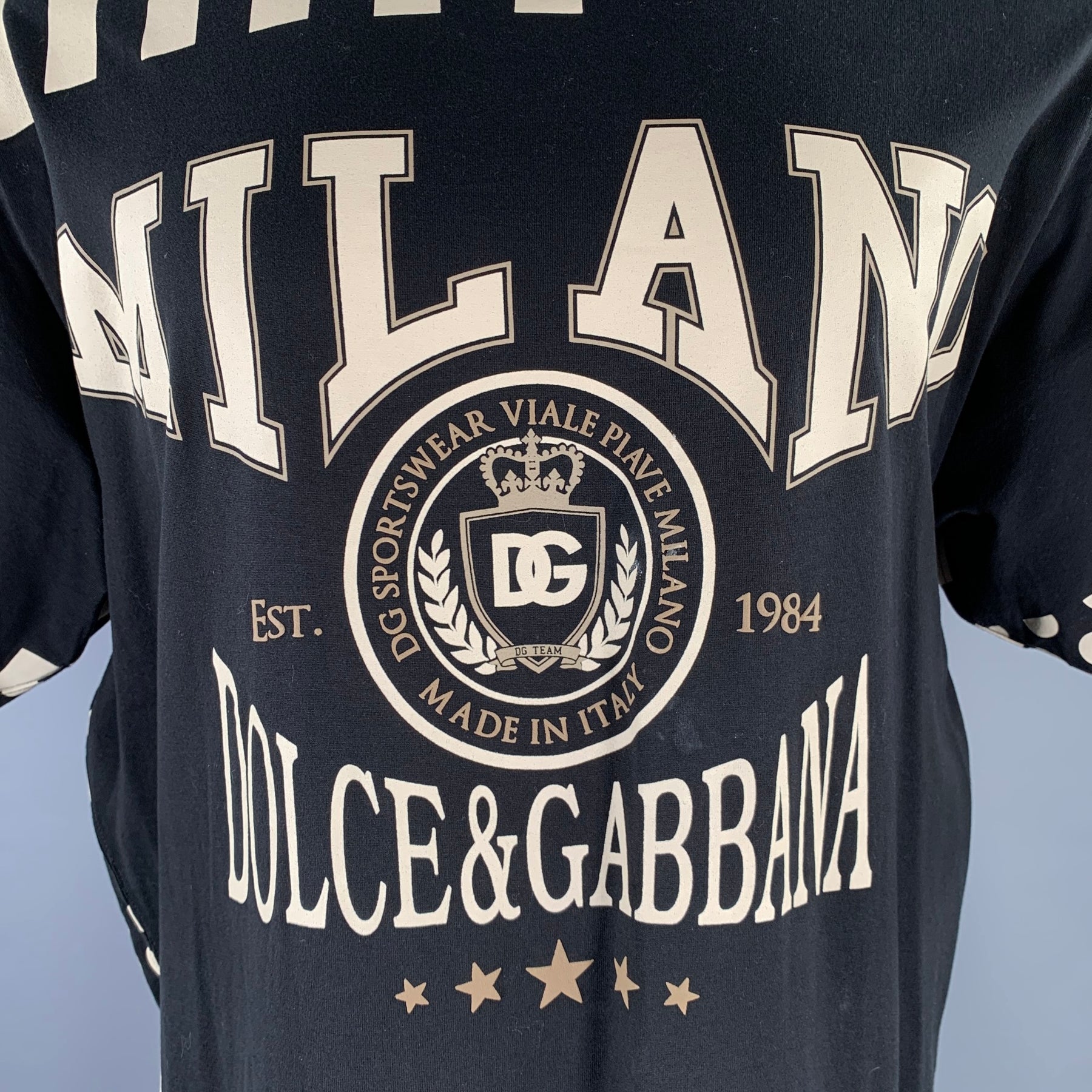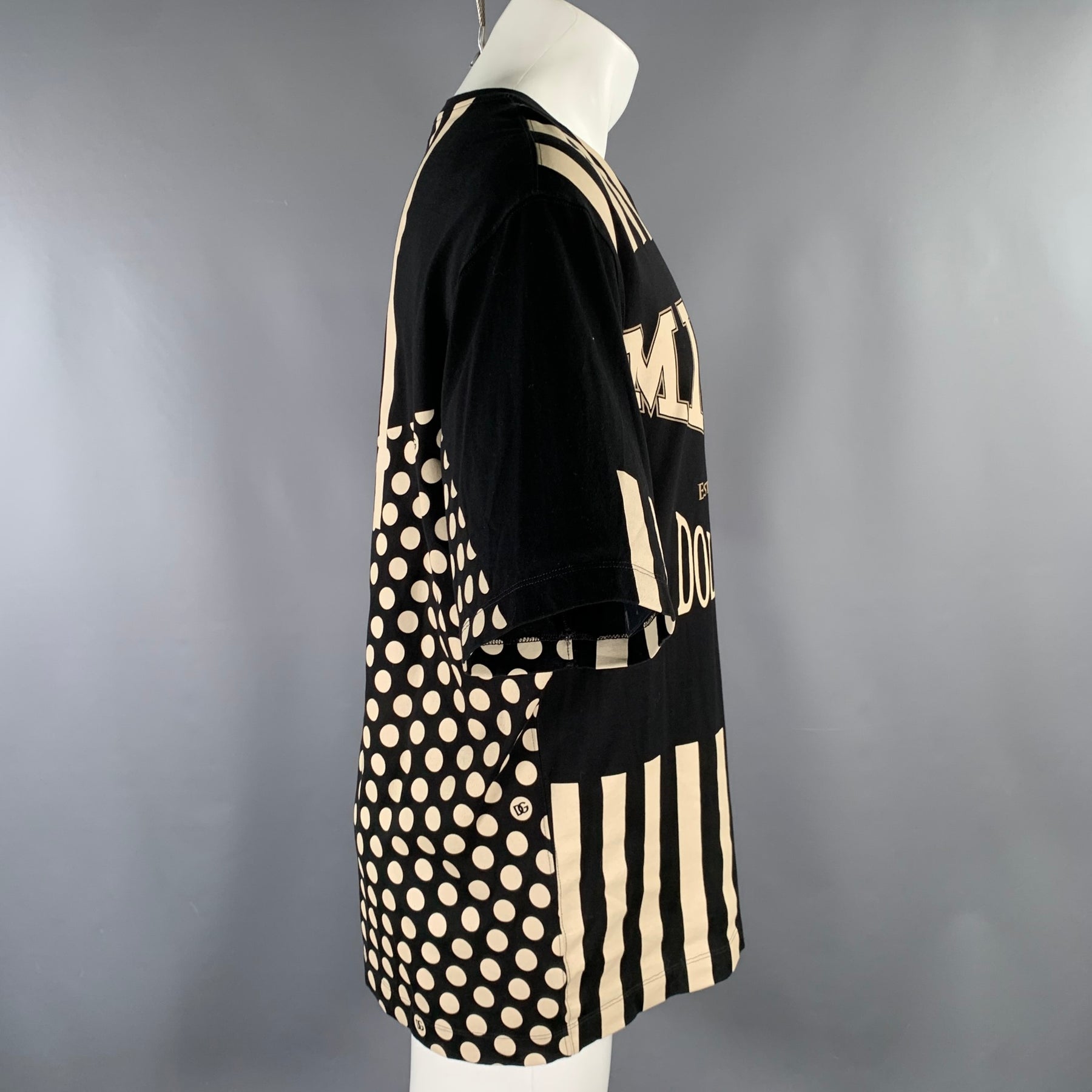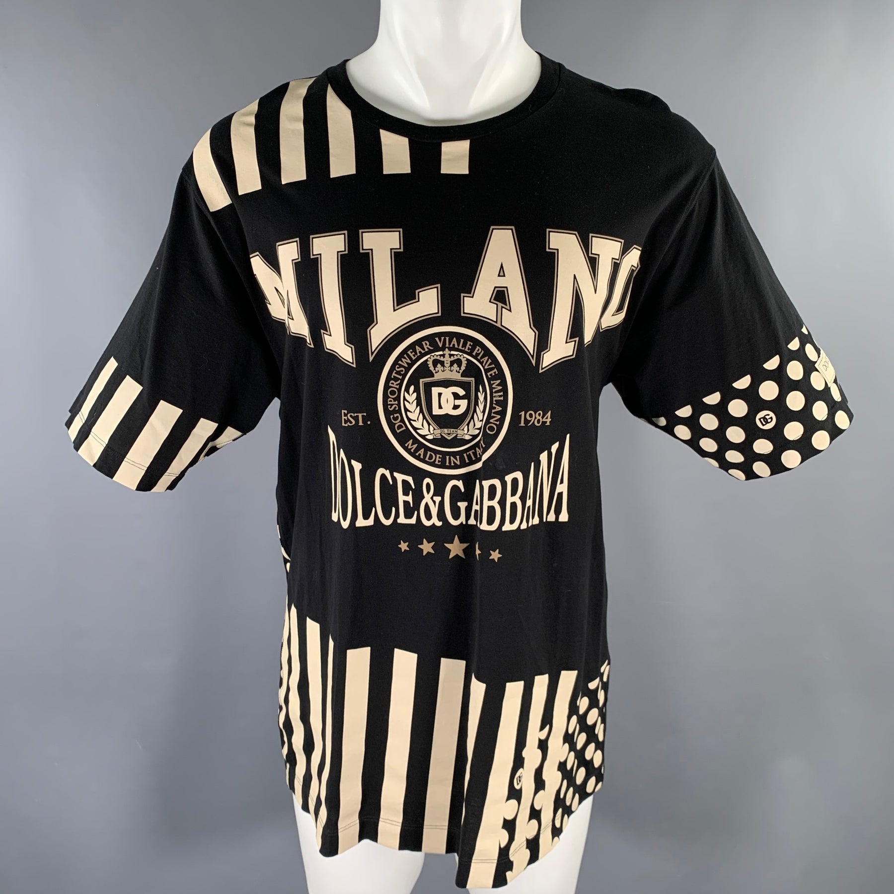 DOLCE & GABBANA oversized black and white T-shirt, expertly crafted in Italy from premium cotton. This adult-sized garment features a bold polka dot and striped pattern, complemented by a graphic "Milano" logo rendered in a classic, collegiate-inspired font.