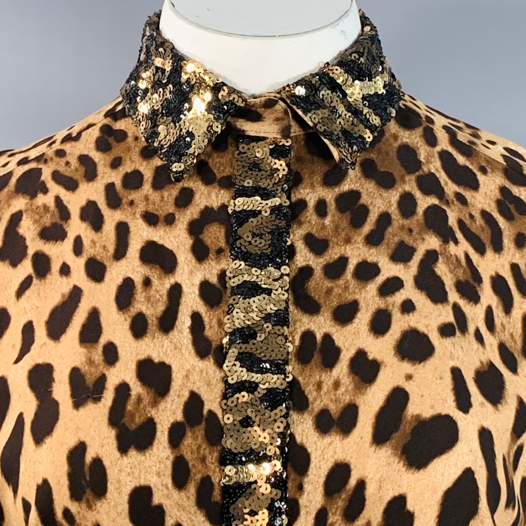 DOLCE & GABBANA shirt in a brown and tan viscose blend fabric featuring a leopard print, sequined trim, and hidden snap closure.