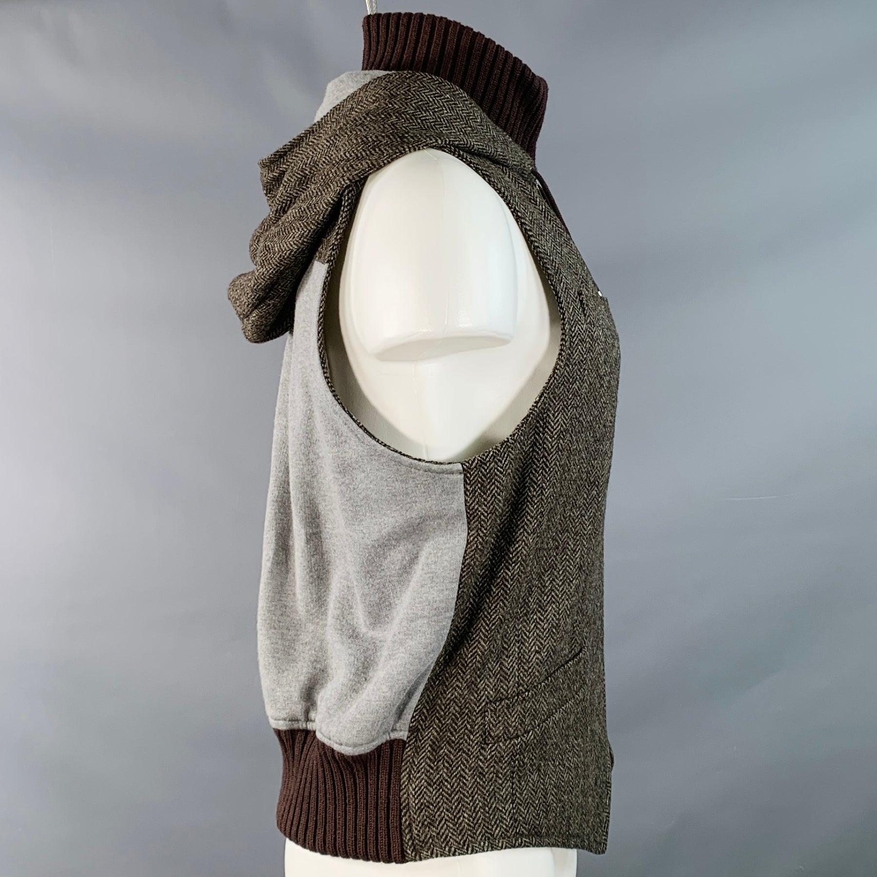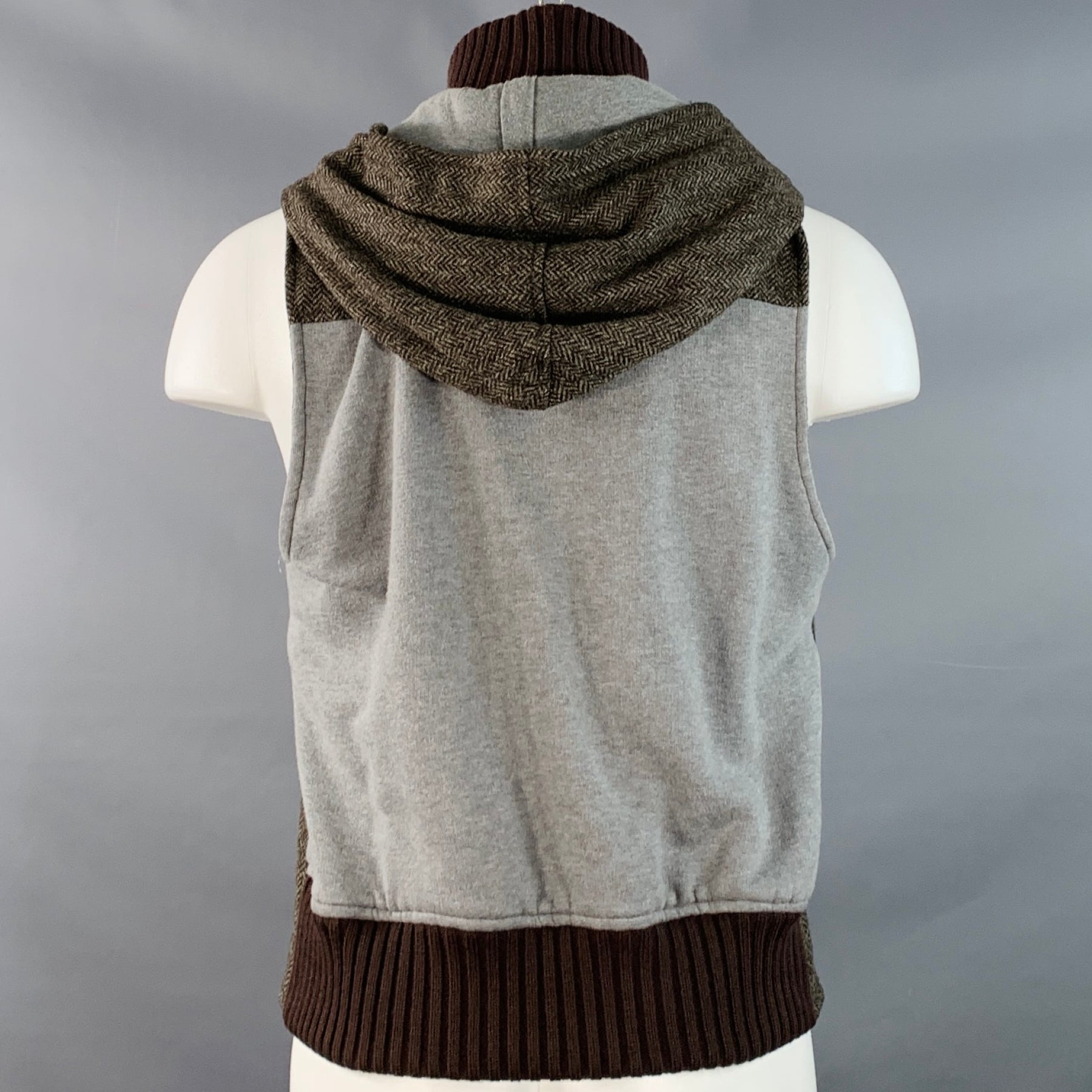 DOLCE & GABBANA vest in a brown wool cotton blend tweed featuring a herringbone pattern, hooded style with ribbed collar, and zip up closure.