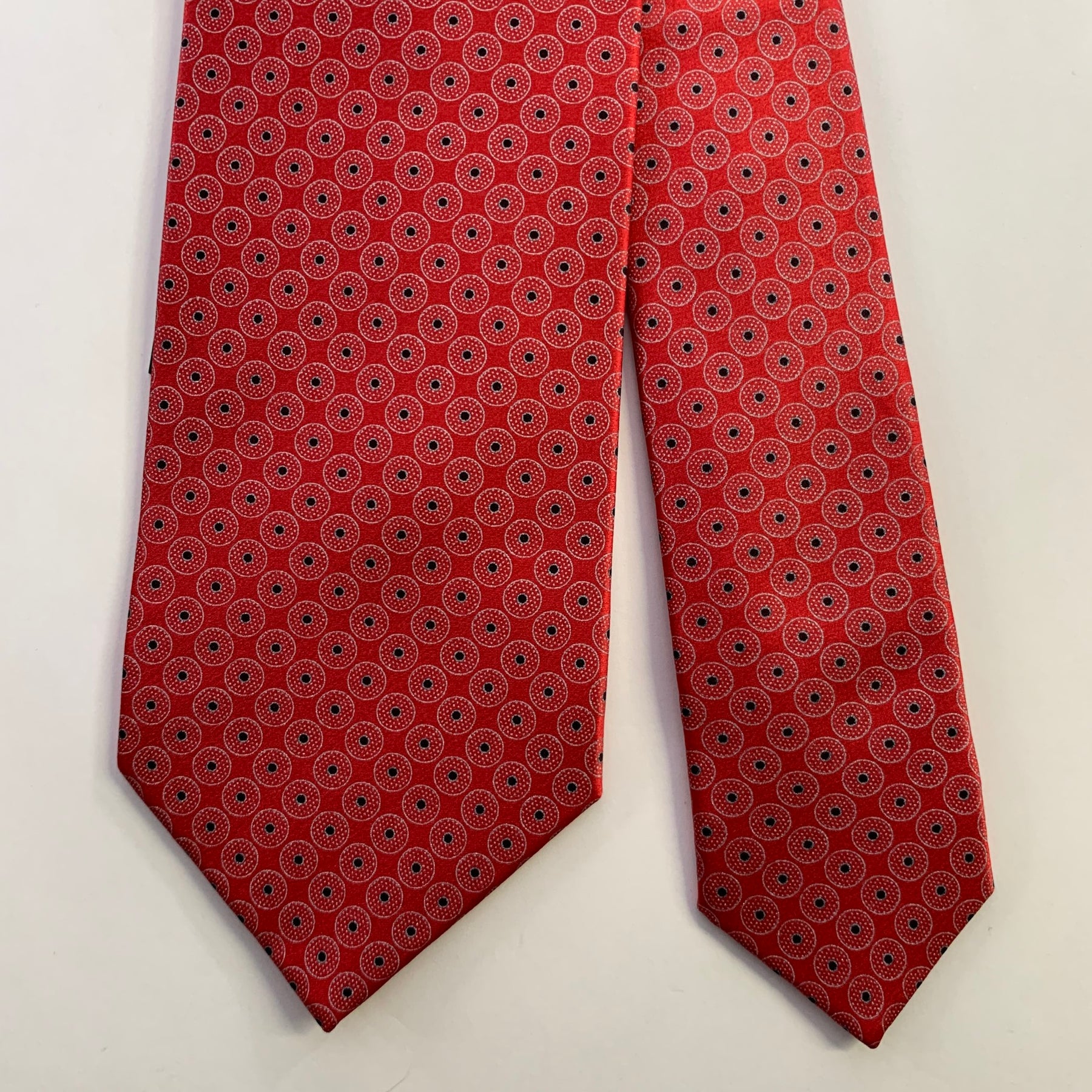 DOLCEPUNTA necktie in a red silk featuring a grey and black circular foulard print . Made in Italy.