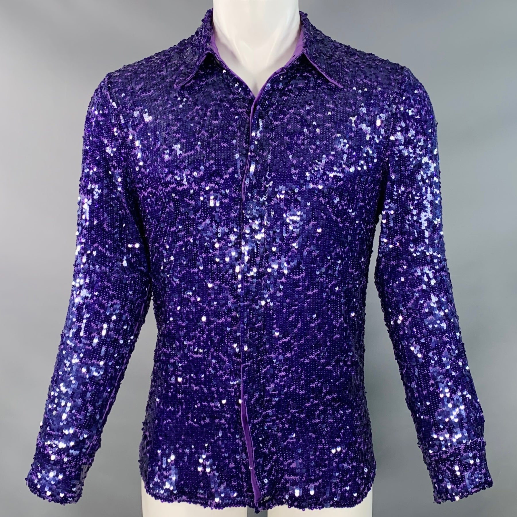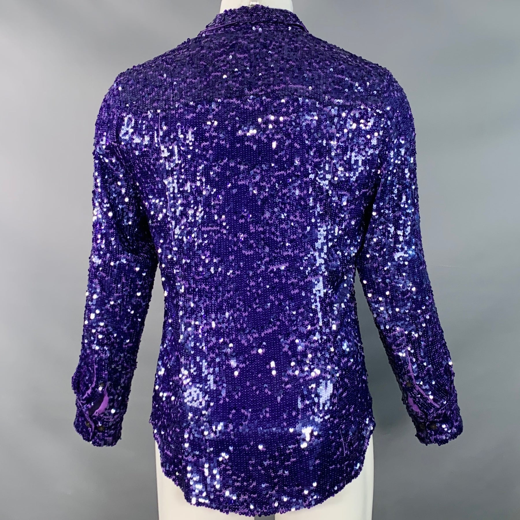 DRIES VAN NOTEN long sleeve shirt in a purple viscose featuring an all over sequined pattern, point collar and hidden placket closure. Note: this garment has been professionally altered, please double check measurements.