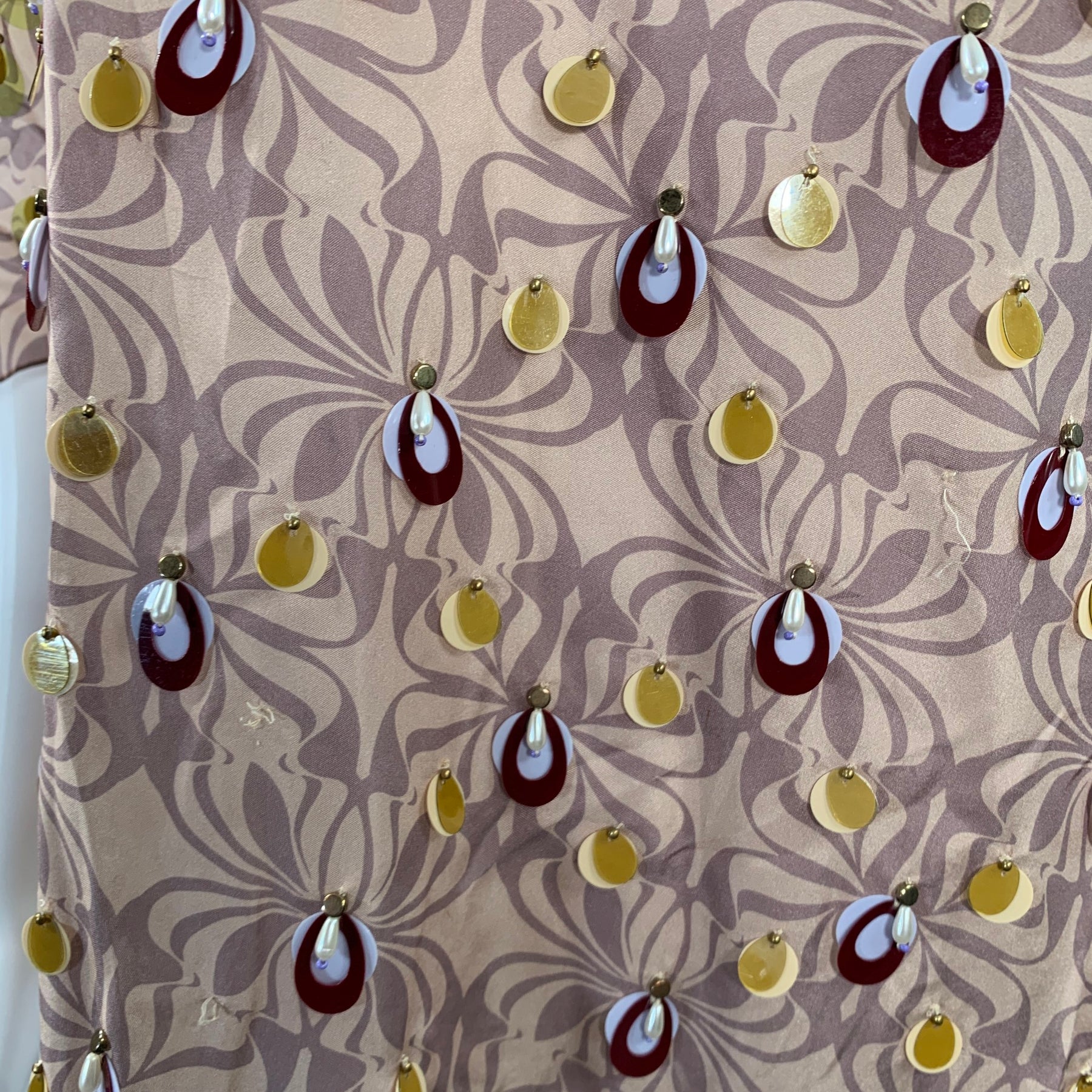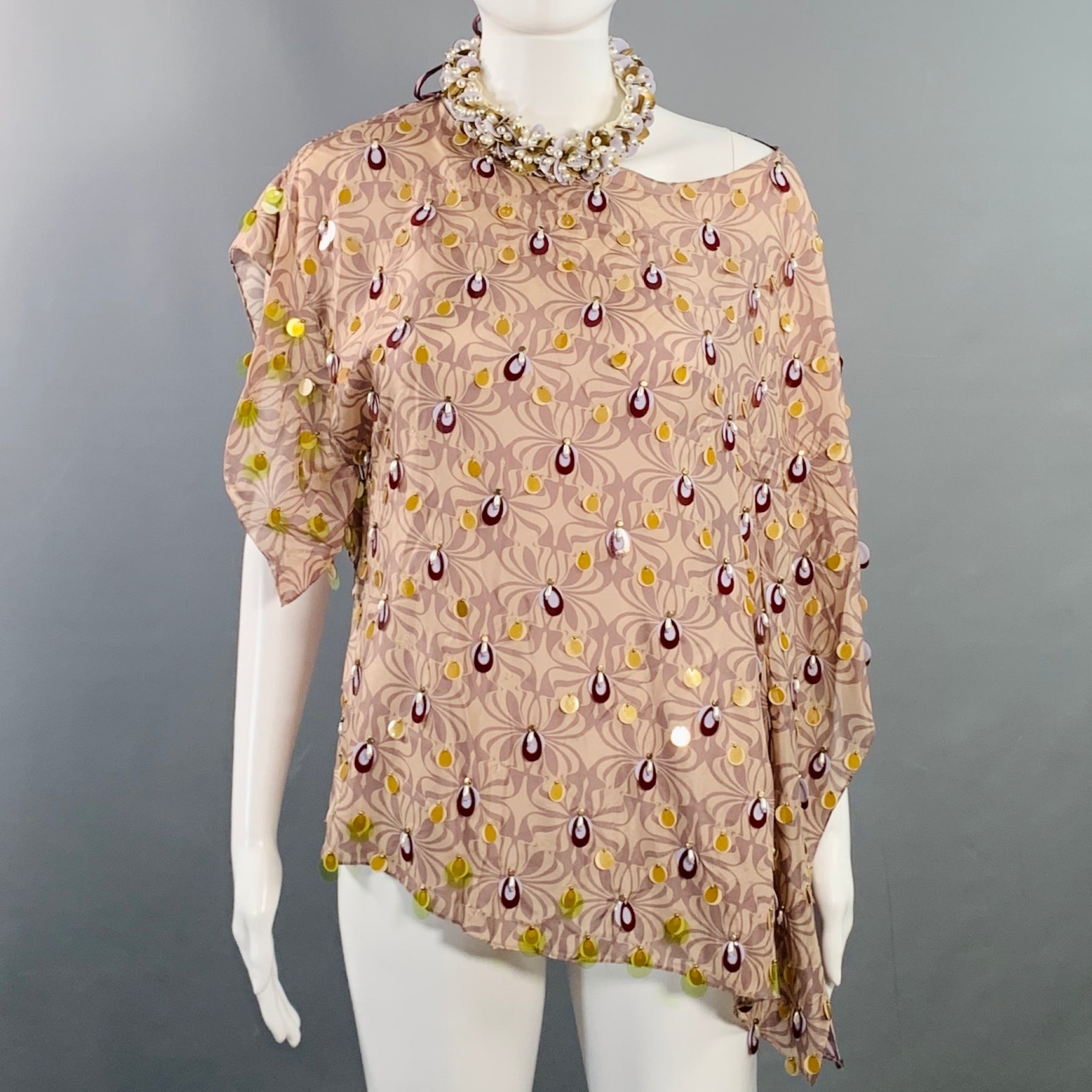 DRIES VAN NOTEN blouse in a purple and mauve silk featuring an asymmetrical style, geometric pattern with beaded embellishments, and chunky beaded halter neckline.