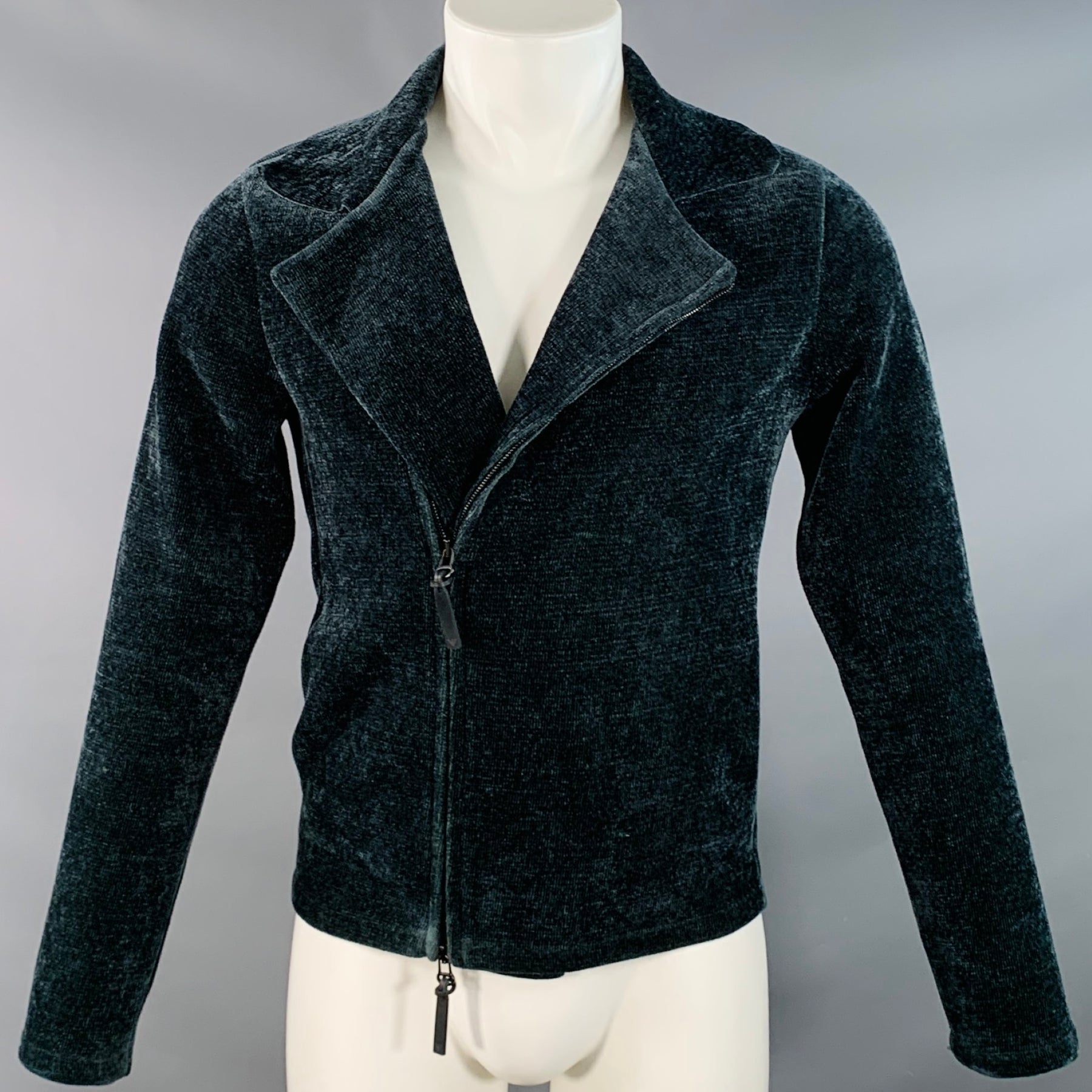 EMPORIO ARMANI jacket in a blue green wool viscose blend velvet featuring two slip pockets, long sleeves, and zip up closure.
