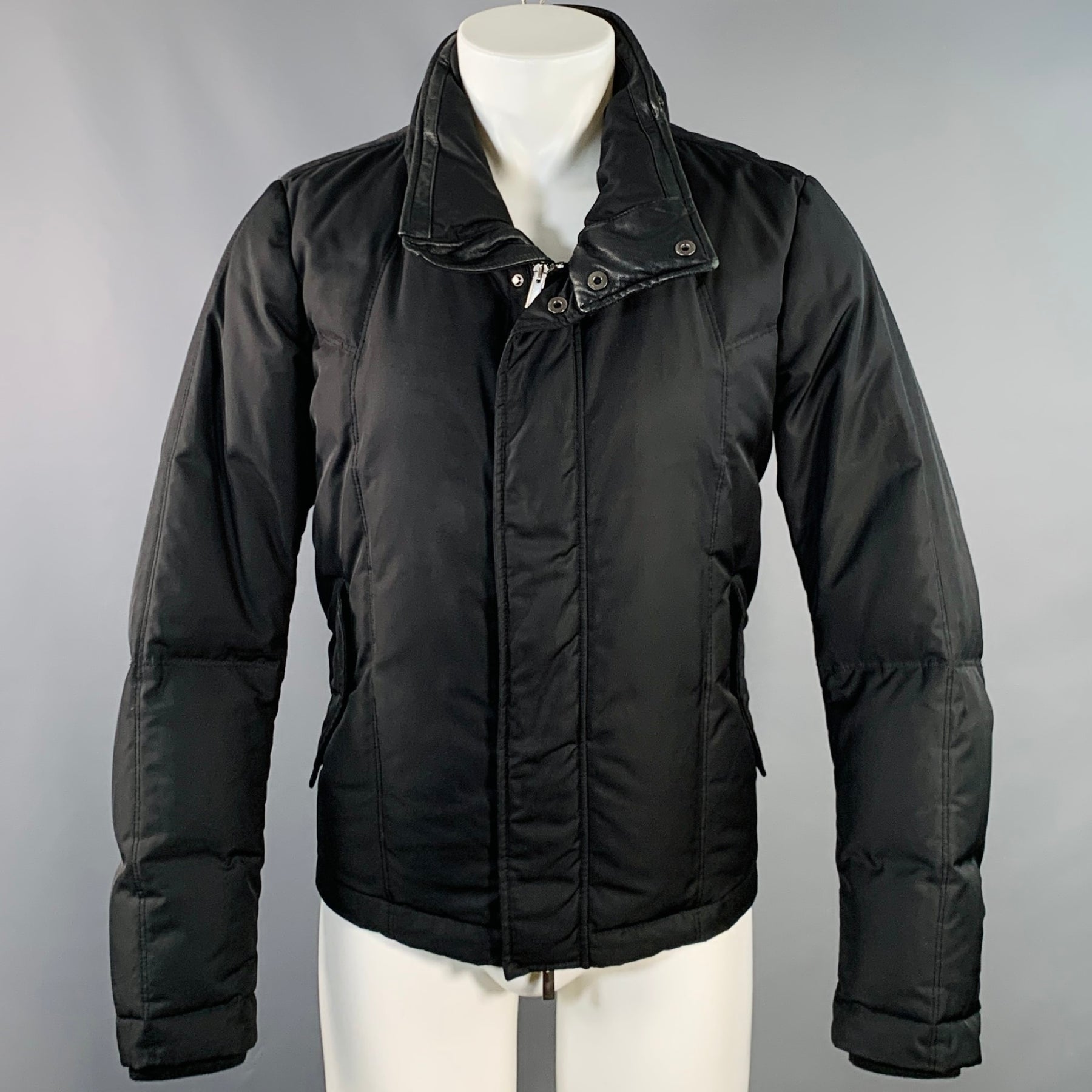 FENDI jacket in a black nylon featuring a padded style, hidden zip away hood, and zip & snaps closure.