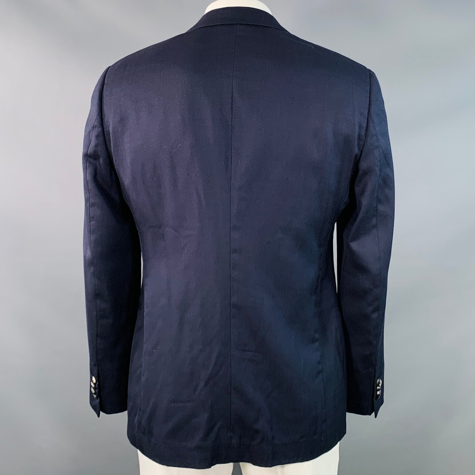 GIORGIO ARMANI sport coat in a navy virgin wool silk blend fabric featuring a notch lapel, ventless back, and double button closure.