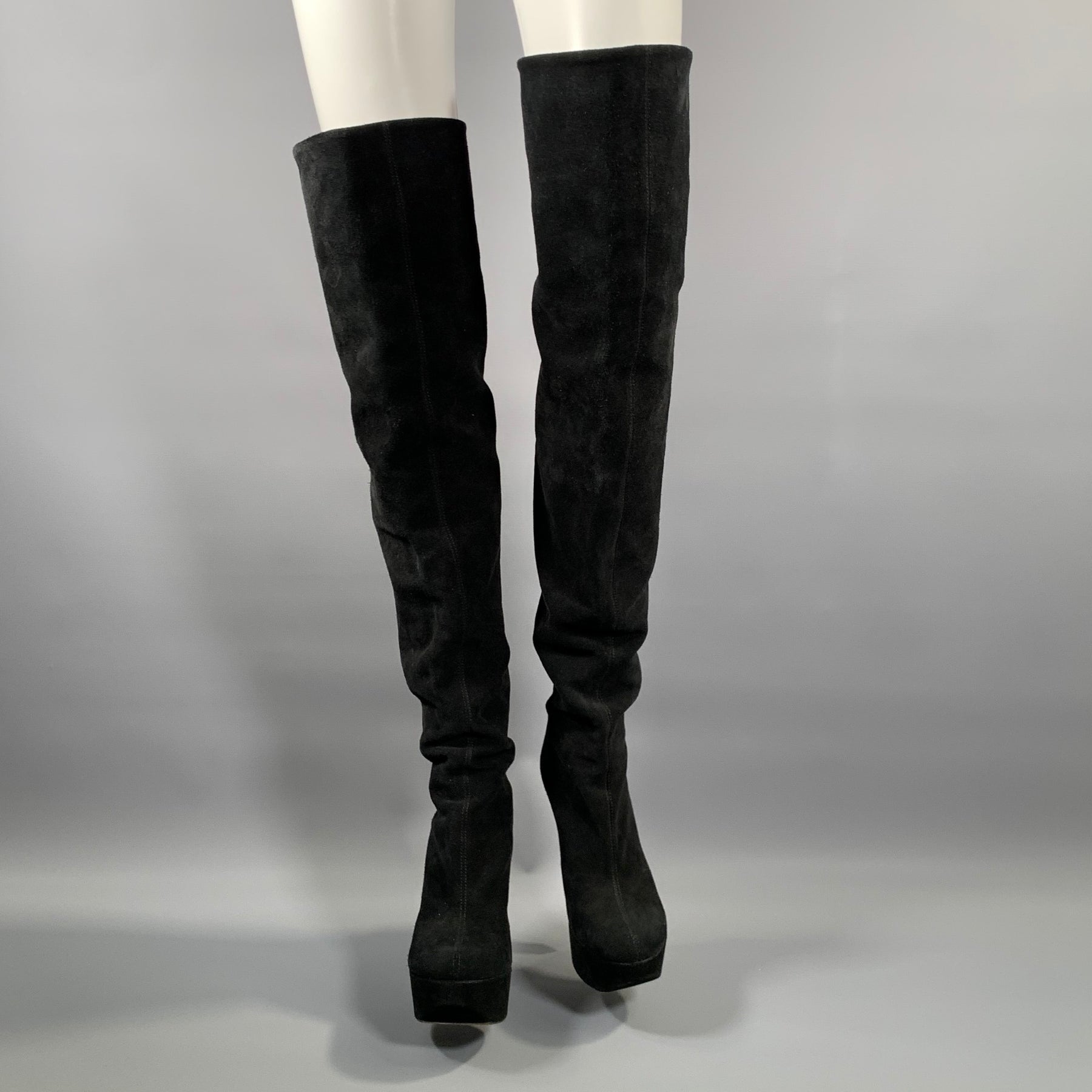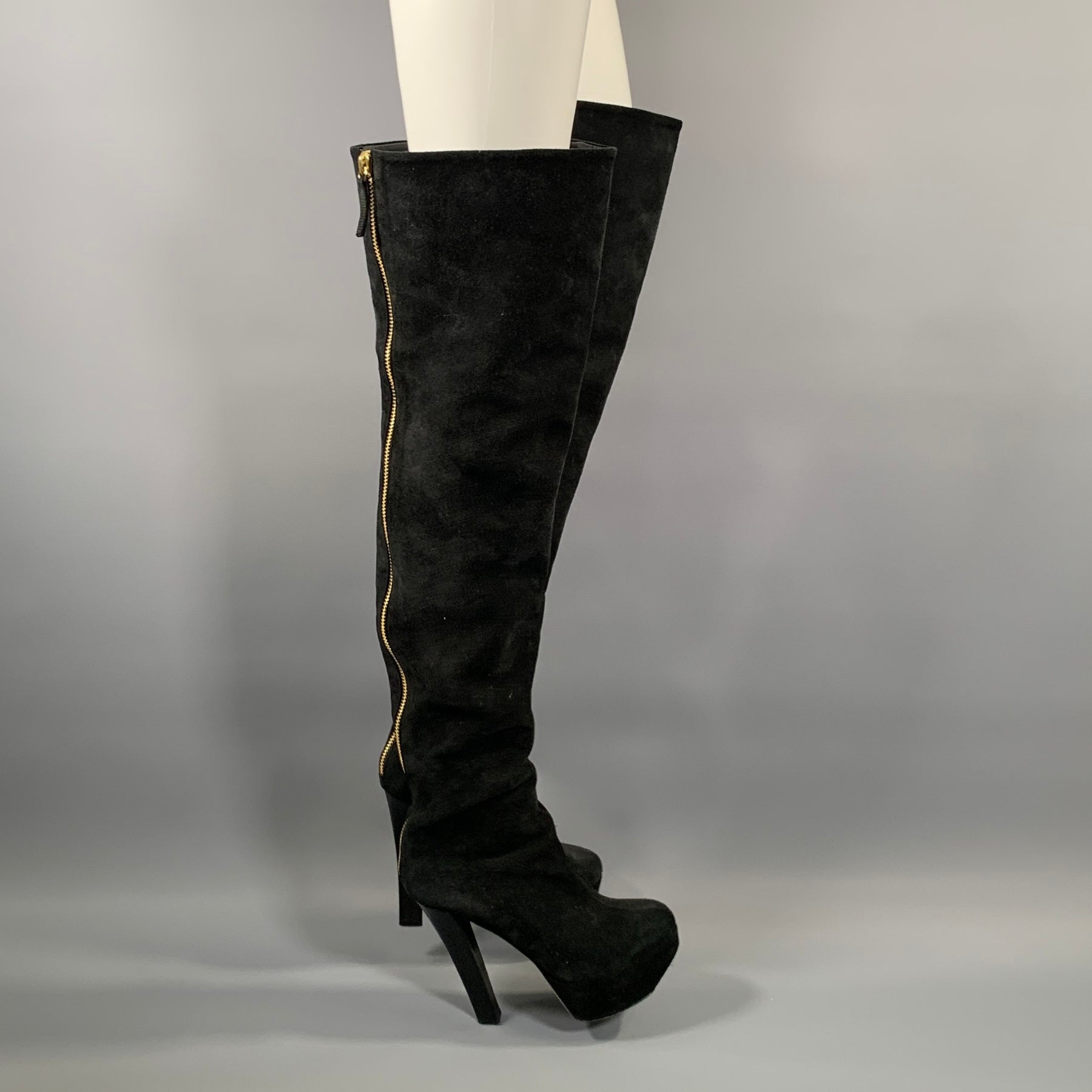 GIUSEPPE ZANOTTI tall boots in a black suede featuring a platform heels, rounded toes, and back gold tone zipper closure. Made in Italy.
