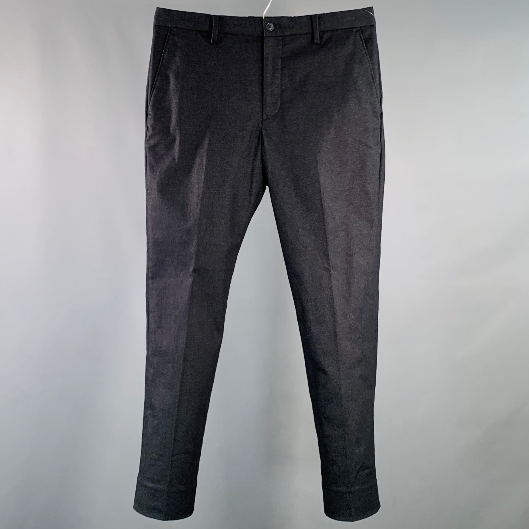GLOBAL WORK casual pants in an indigo cotton blend twill denim featuring a tapered leg, flat front, and zip fly closure with drawstring.
