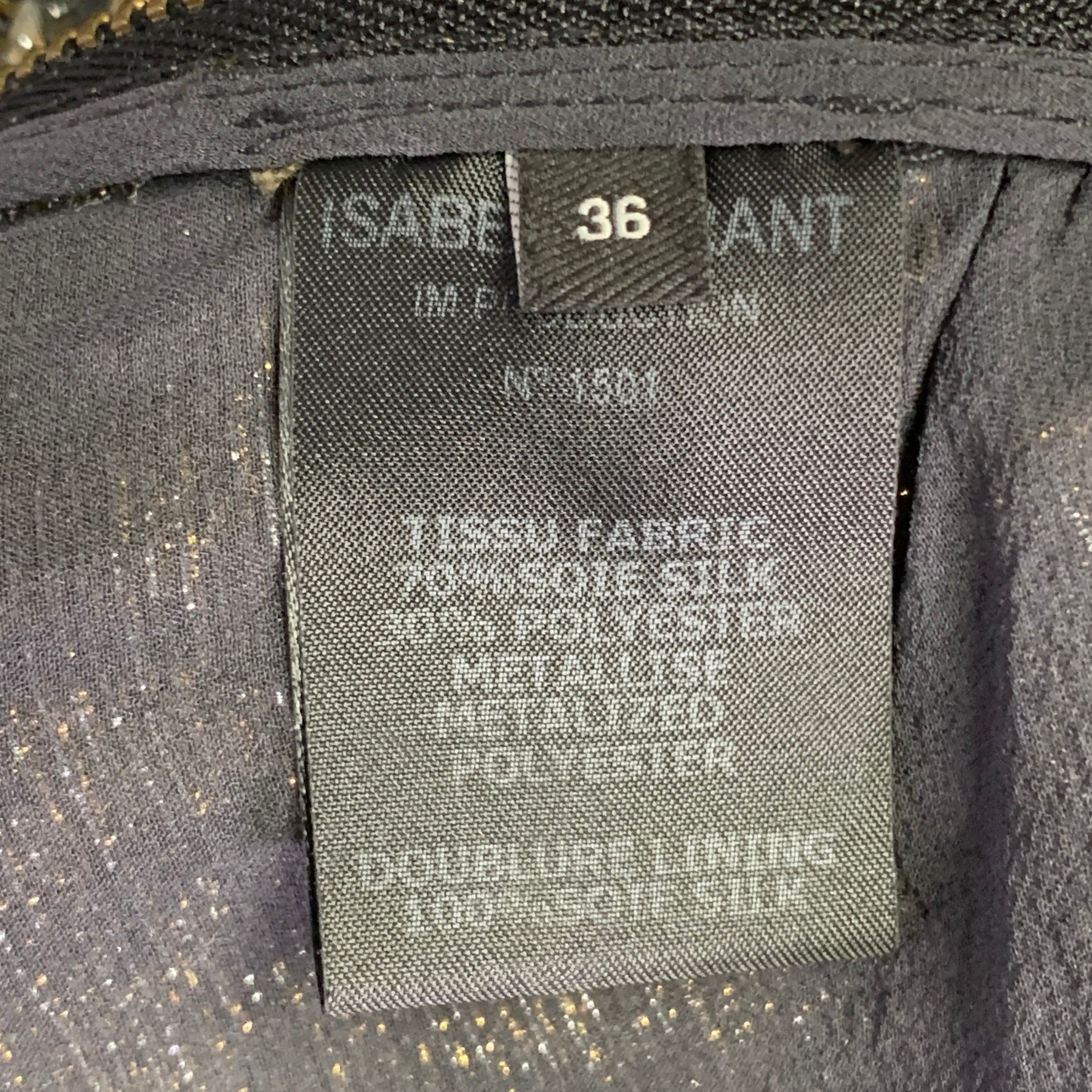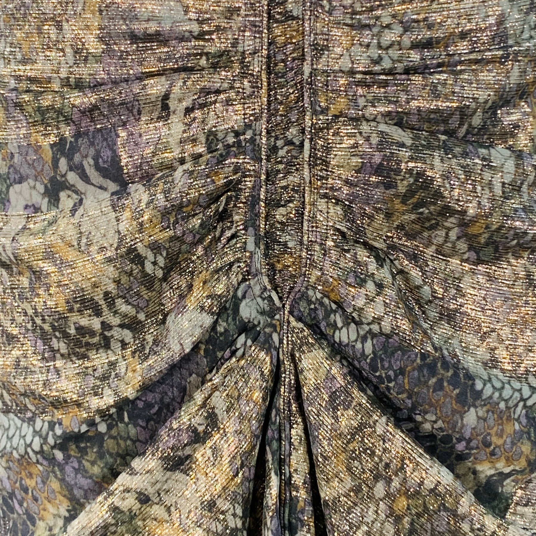 ISABEL MARANT knee length skirt in a metallic gold tone and grey silk blend fabric featuring a ruched fishtail style, snake print, and back zipper closure.