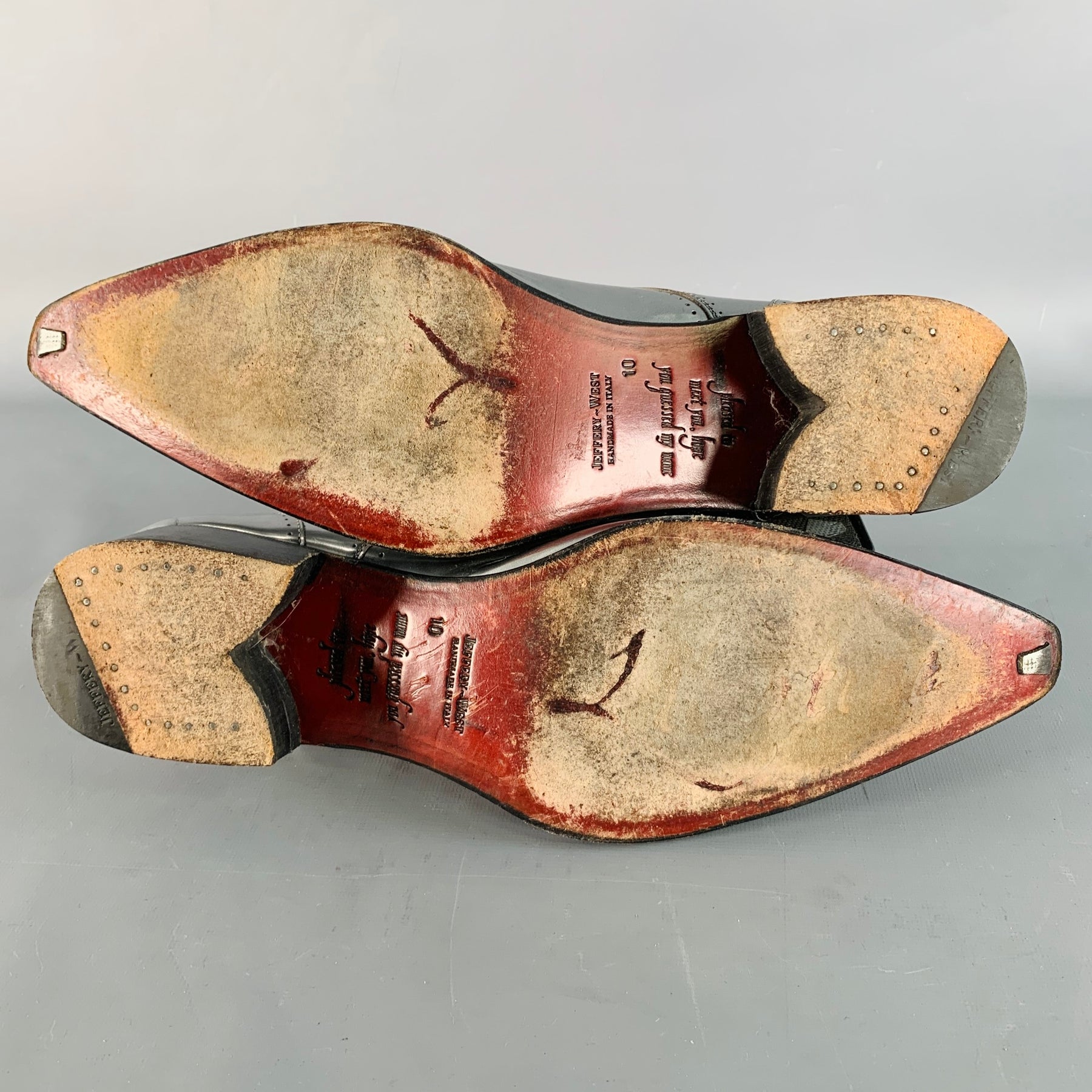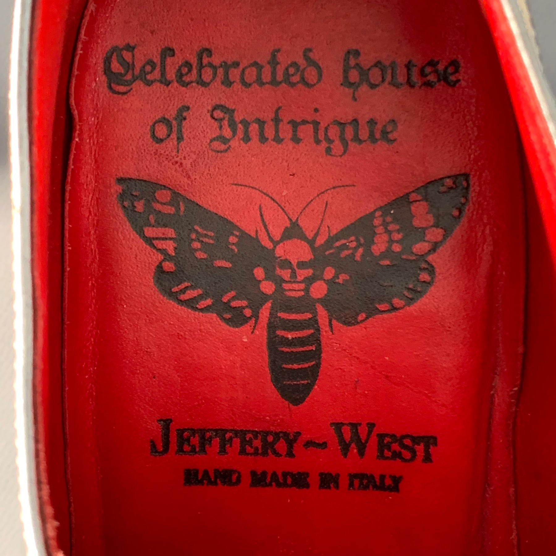 JEFFERY WEST derby shoes in a metallic silver tone leather featuring a perforated style with pointed toe, and slip on closure. Shoe trees not included. Handmade in Italy.