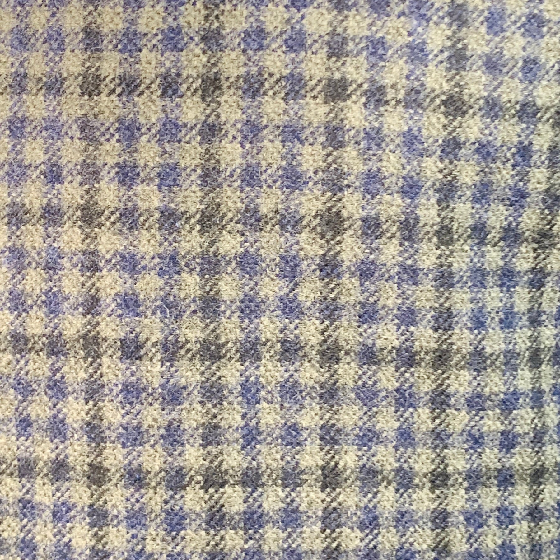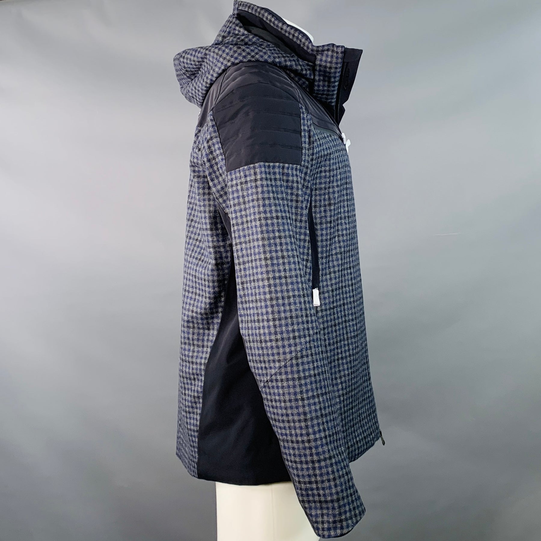 KJUS "Formula S.E." ski jacket in a black polyamide stretch blend fabric featuring a grey and blue plaid pattern, hooded style, and zip up closure. Fabric made in Italy by LORO PIANA.