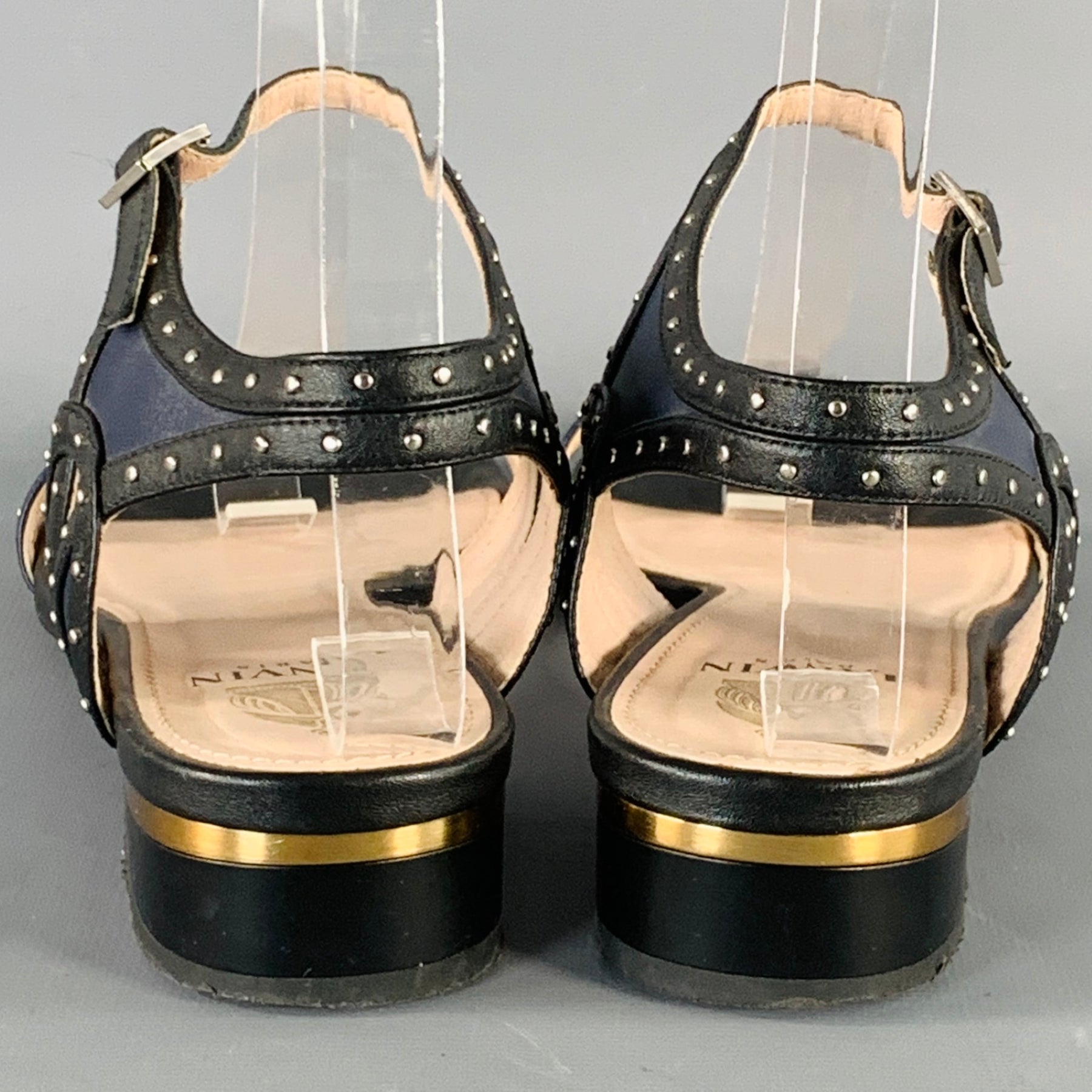 LANVIN sandals in a navy and black leather featuring a studded design, gold tone metal heel accent, and ankle strap closure.