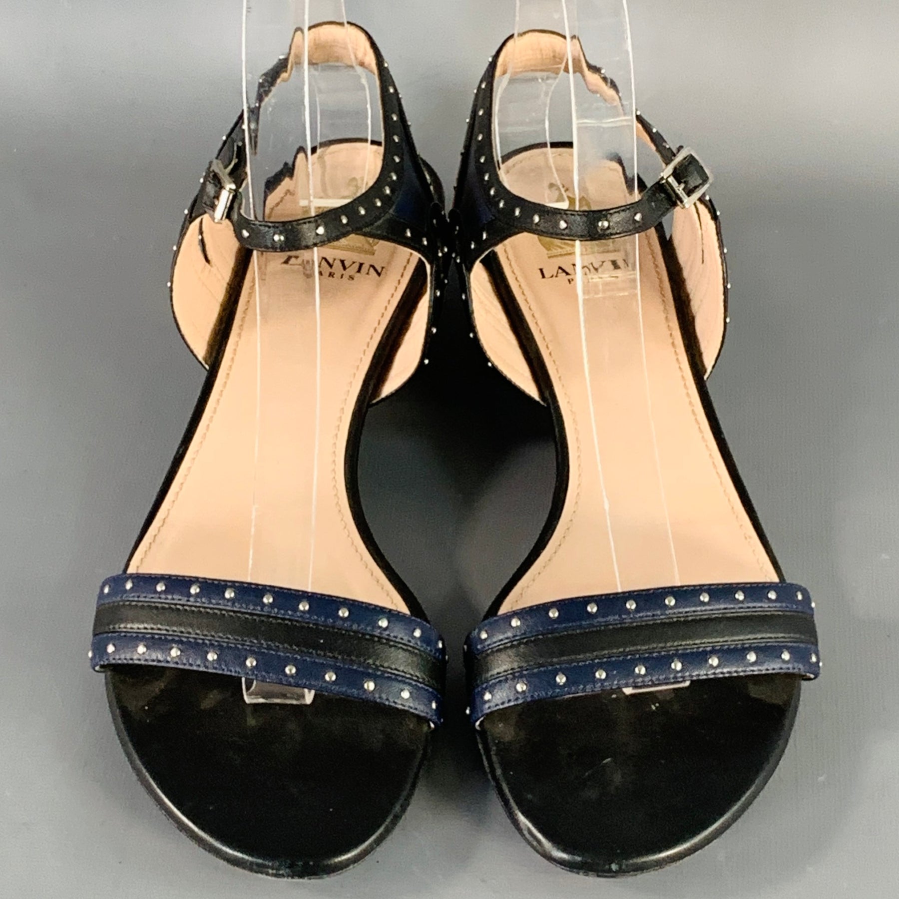 LANVIN Size 8.5 Navy Black Leather Studded Ankle Strap Sandals