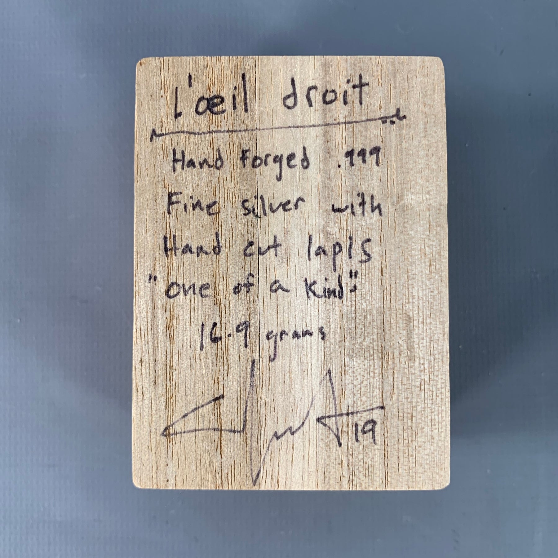 LOCUST HOUSE "L'Oeil Droit" ring in a handforged .999 pure silver featuring a hand cut lapis lazuli and chunky design. Comes with box.
