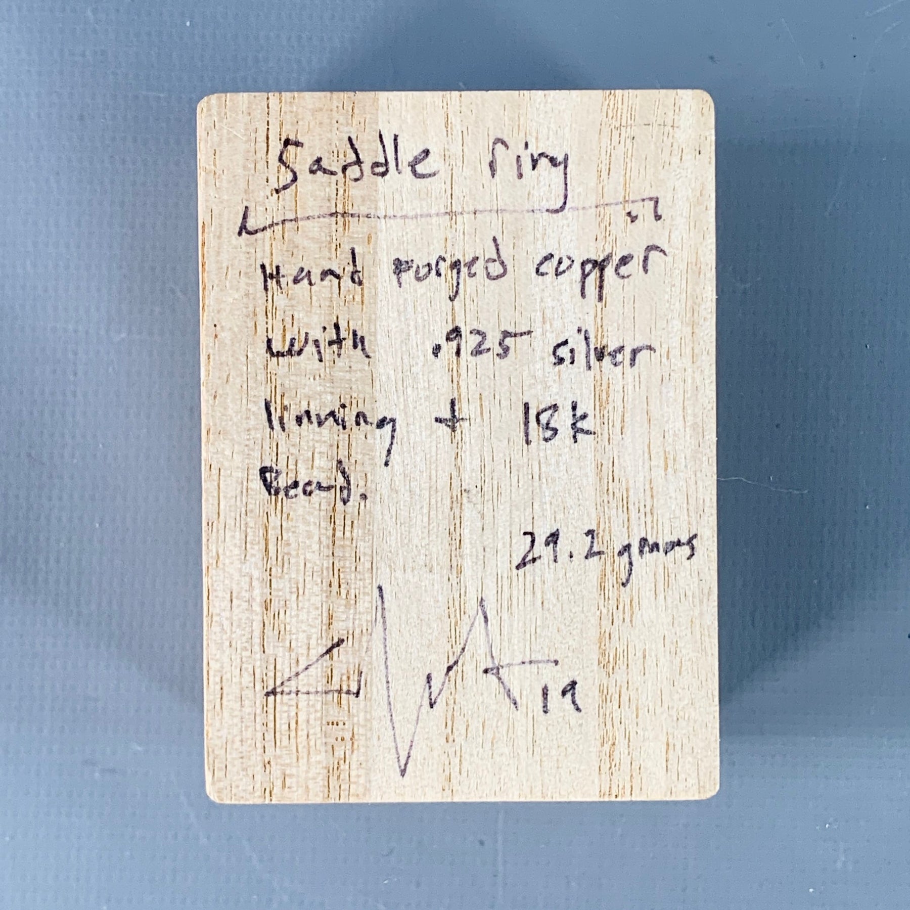 LOCUST HOUSE "Saddle Ring" ring in a hand forged copper with sterling silver lining featuring a chunky style with 18k gold accent bead. Comes with box.