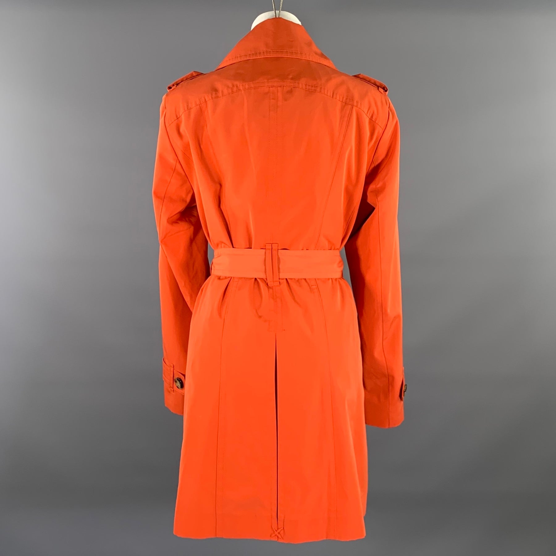London Fog double-breasted trench coat in a orange polyester features a belted waist, flap pockets and a single vent at the back.