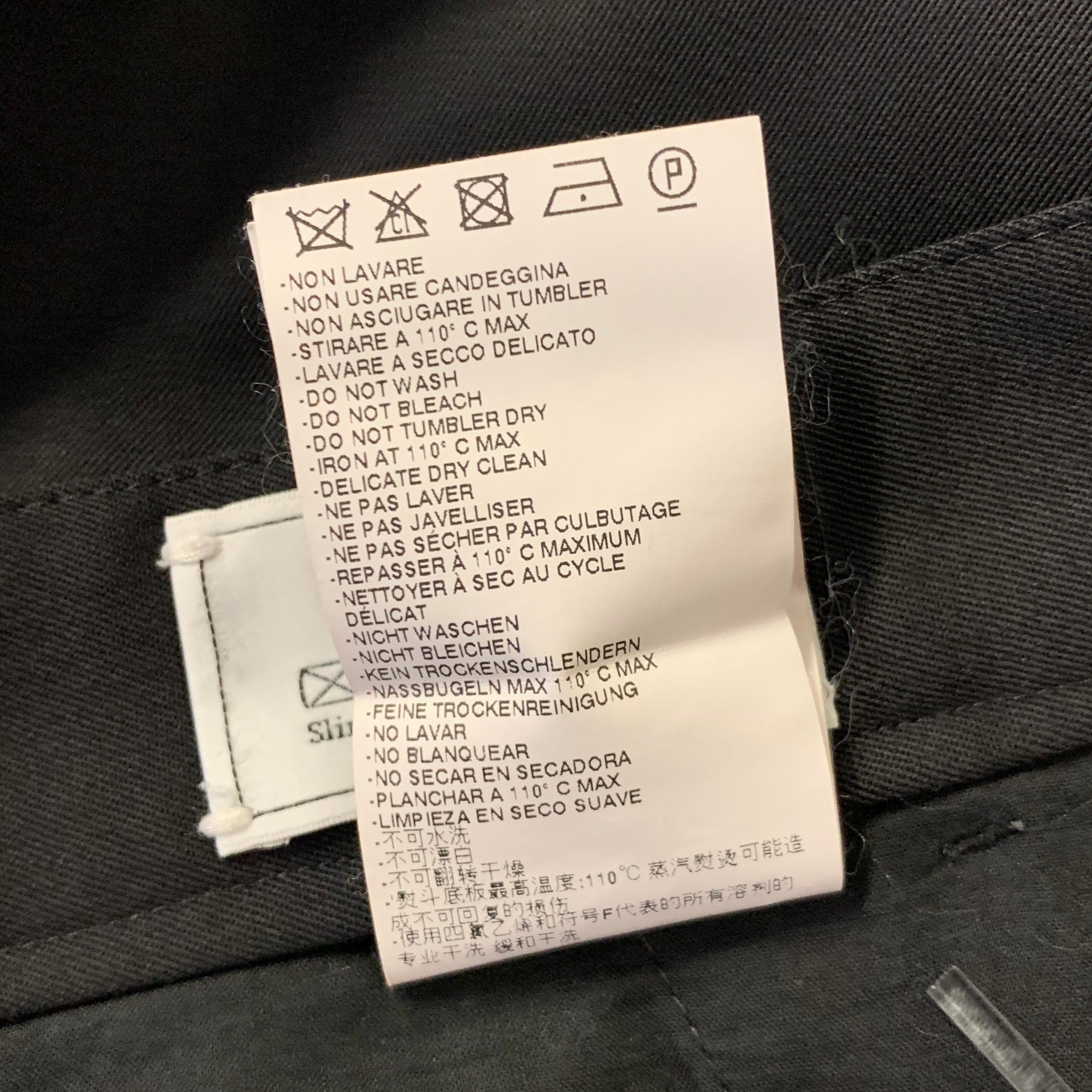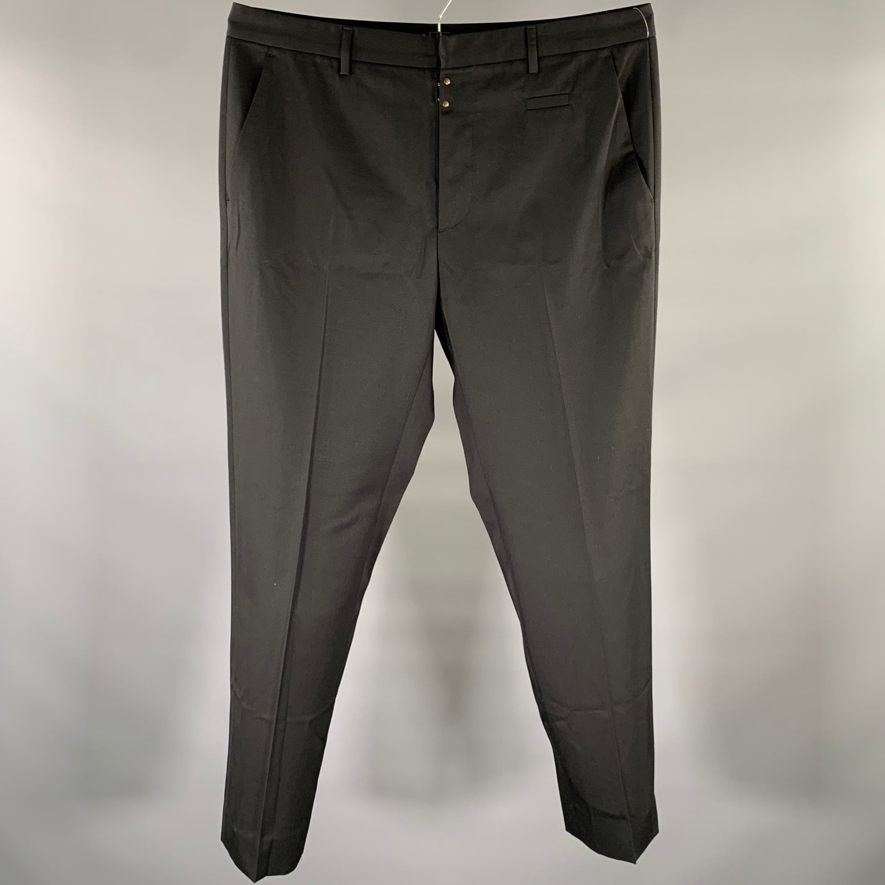 Maison Margiela dress pants offer a sophisticated blend of luxury and comfort. Crafted in Italy from black wool, the slim straight design features a signature button fly with metal hardware, balancing classic tailoring with a modern, avant-garde edge.