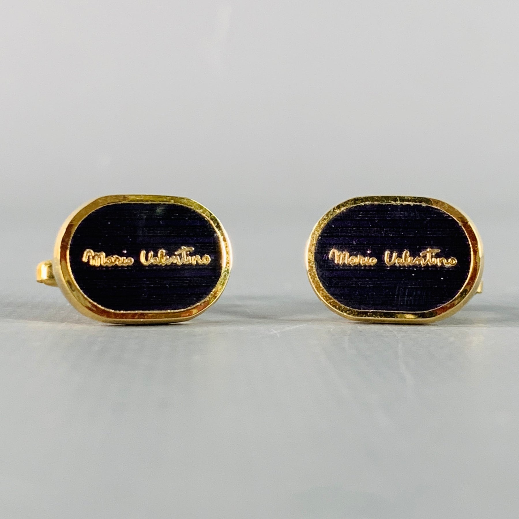 Vintage MARIO VALENTINO cufflinks in a gold tone metal and purple material featuring a gold tone metal signature design.