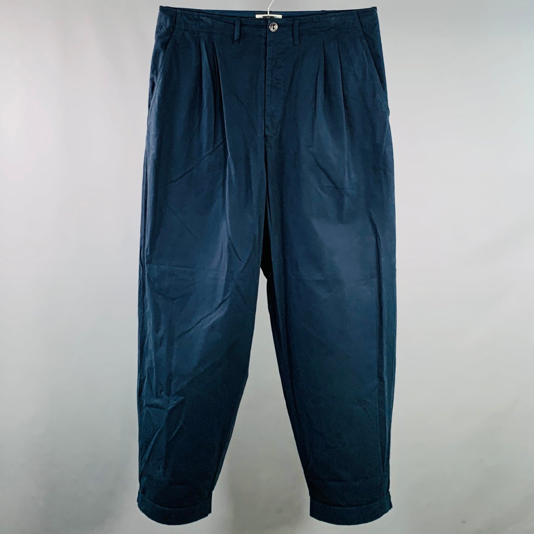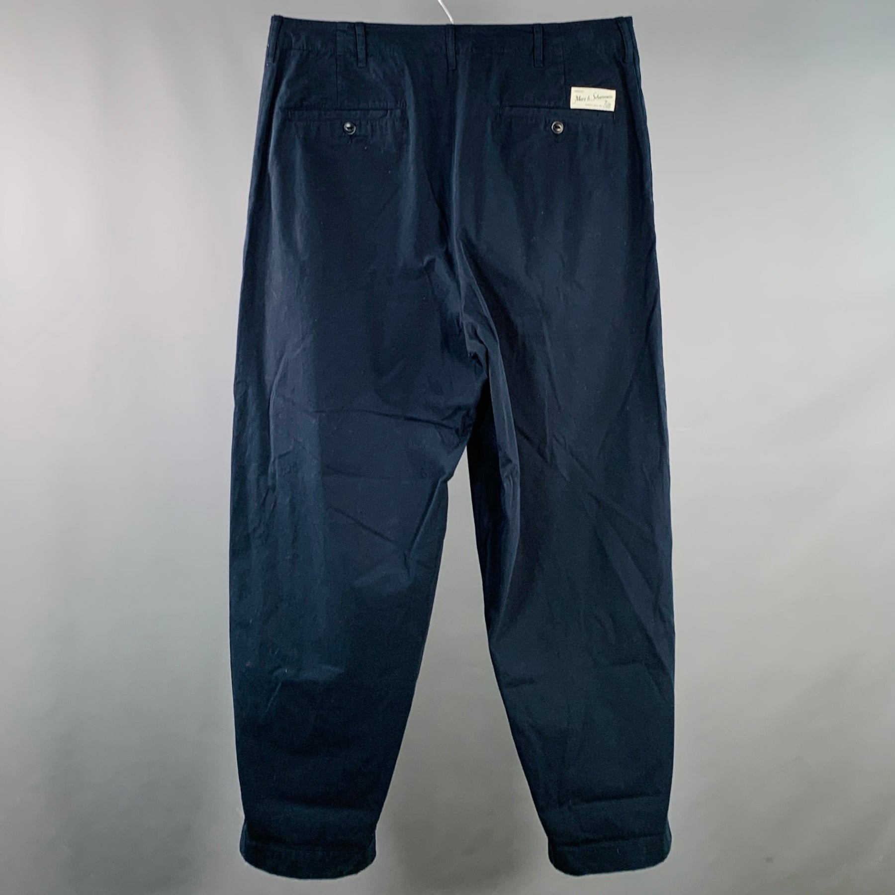 MERZ B. SCHWANEN casual pants in a navy cotton woven fabric featuring a pleated style, tapered cuffed leg, and button fly closure.