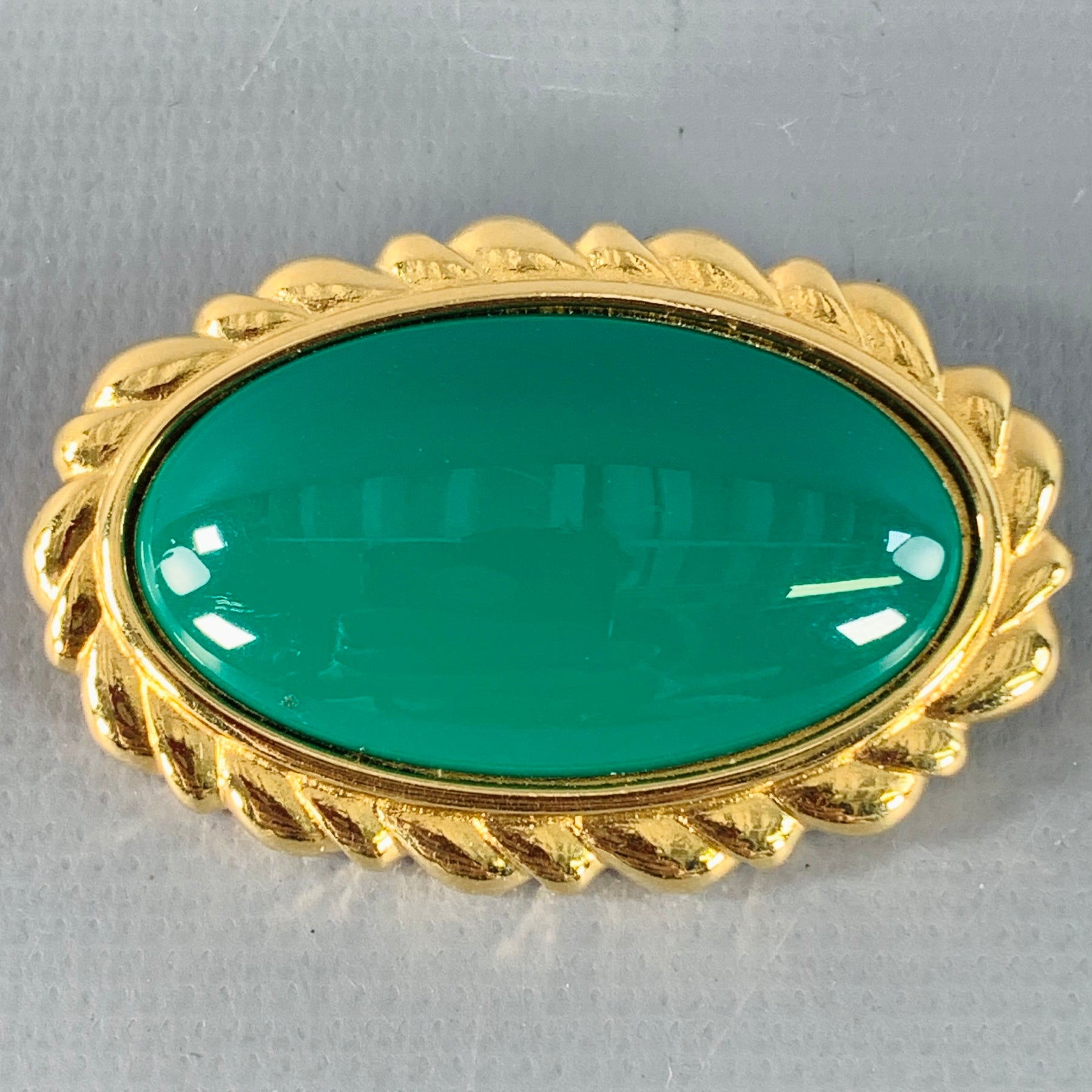 Vintage MONET brooch in a green enamel and gold tone metal featuring an oval shape, and engraved border.