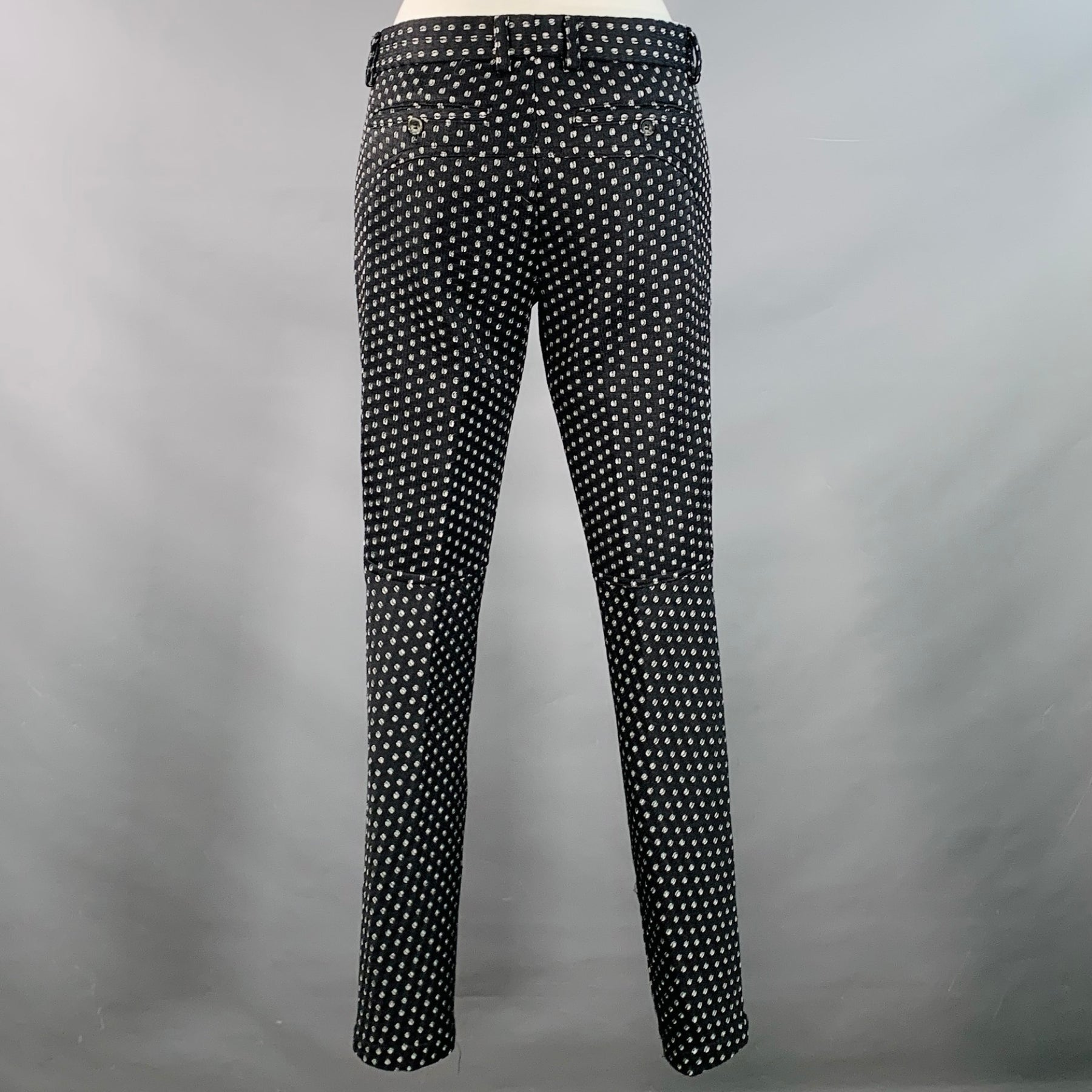 MR TURK suit in a black and white perforated polyester with a full liner and includes a single breasted, double button sport coat with a notch lapel and matching flat front trousers. Made in Italy.