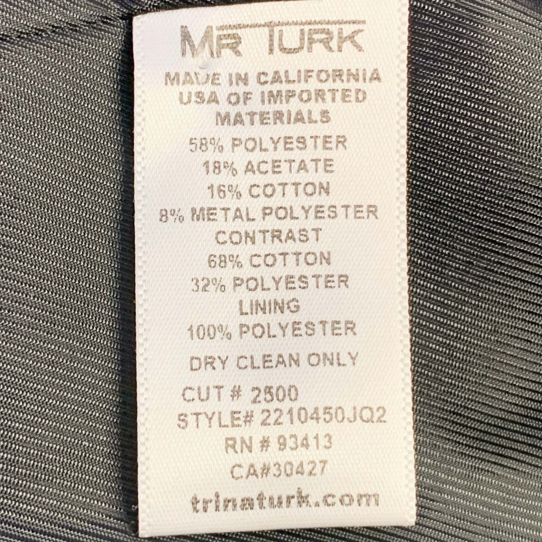 MR TURK sport coat in a black polyester blend fabric featuring a metallic pink and green floral jacquard, shawl lapel, single vented back, and single button closure. Made in USA.