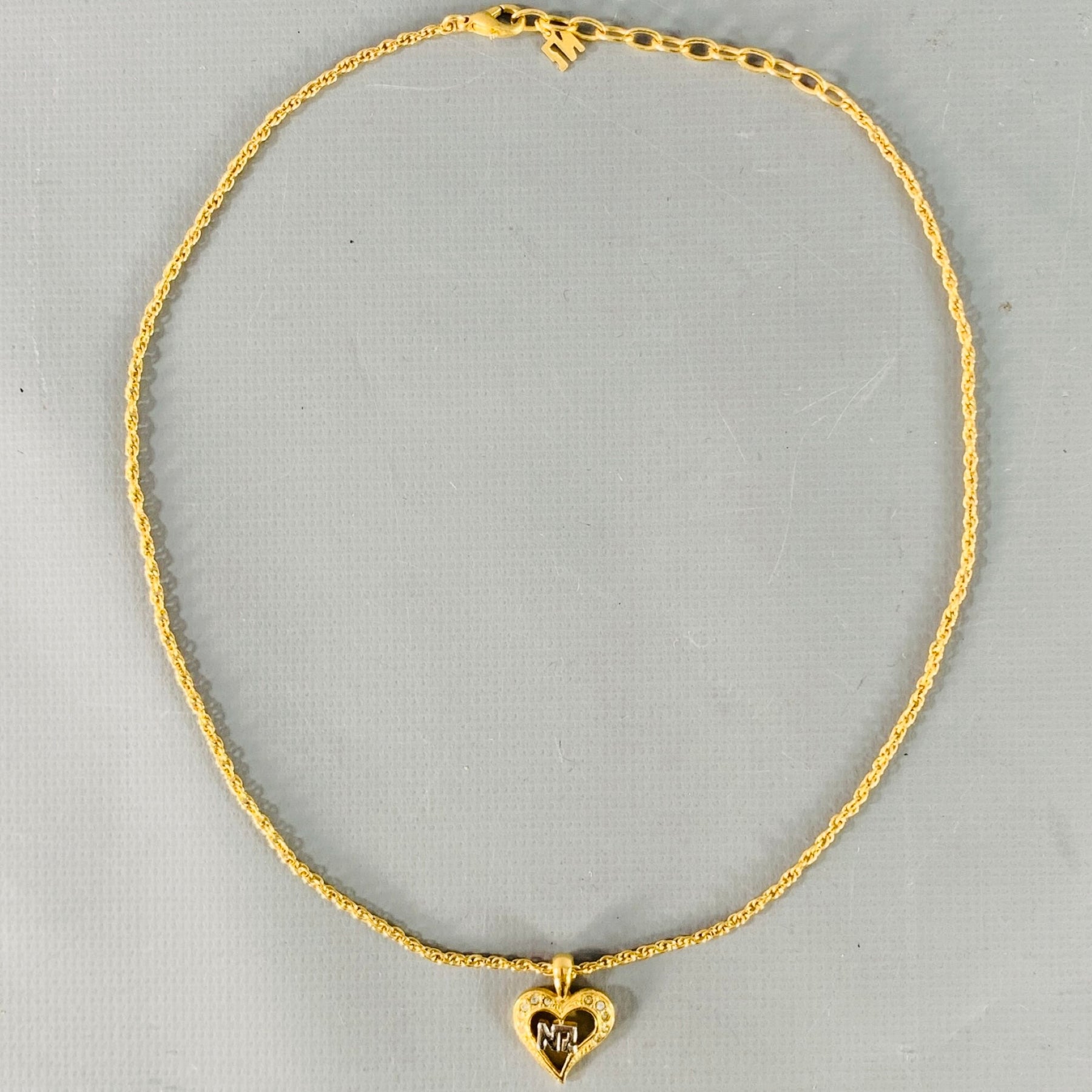 NINA RICCI necklace in a gold tone metal featuring a heart shaped pendant with monogram, rhinestone studded details, and lobster clasp closure.