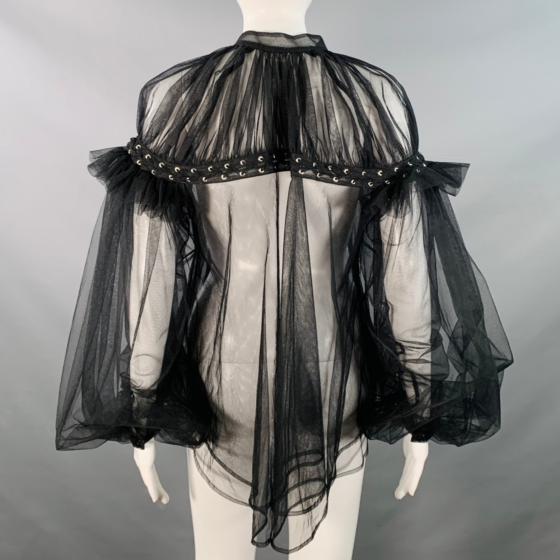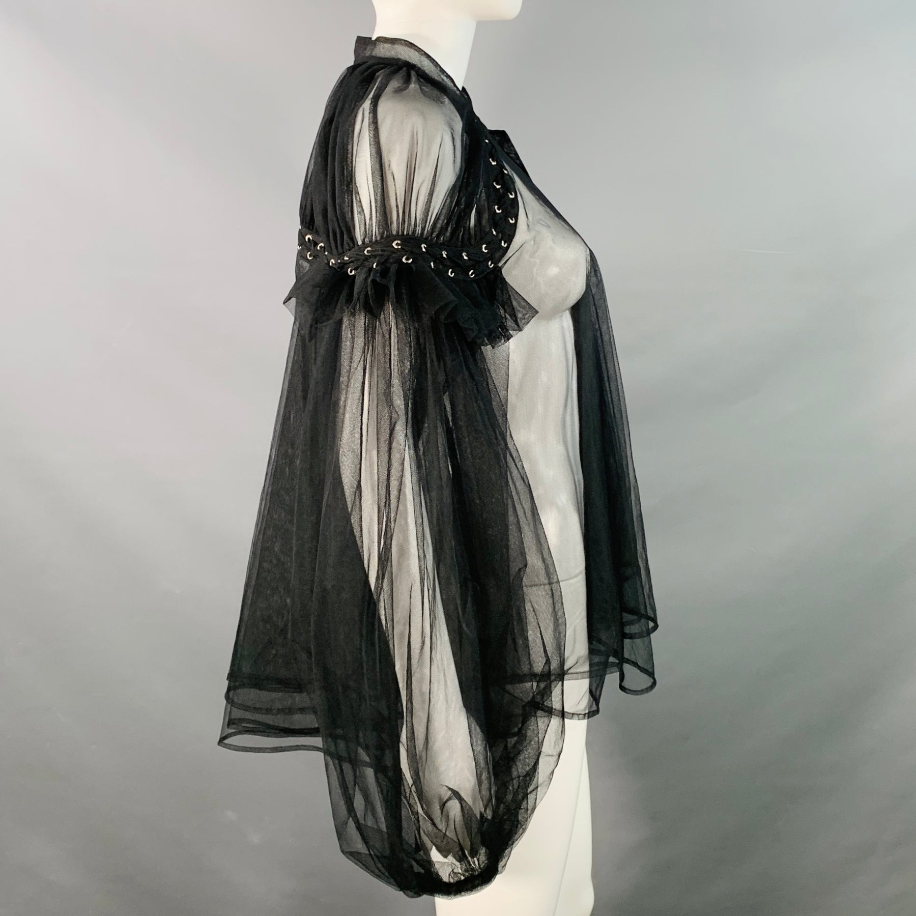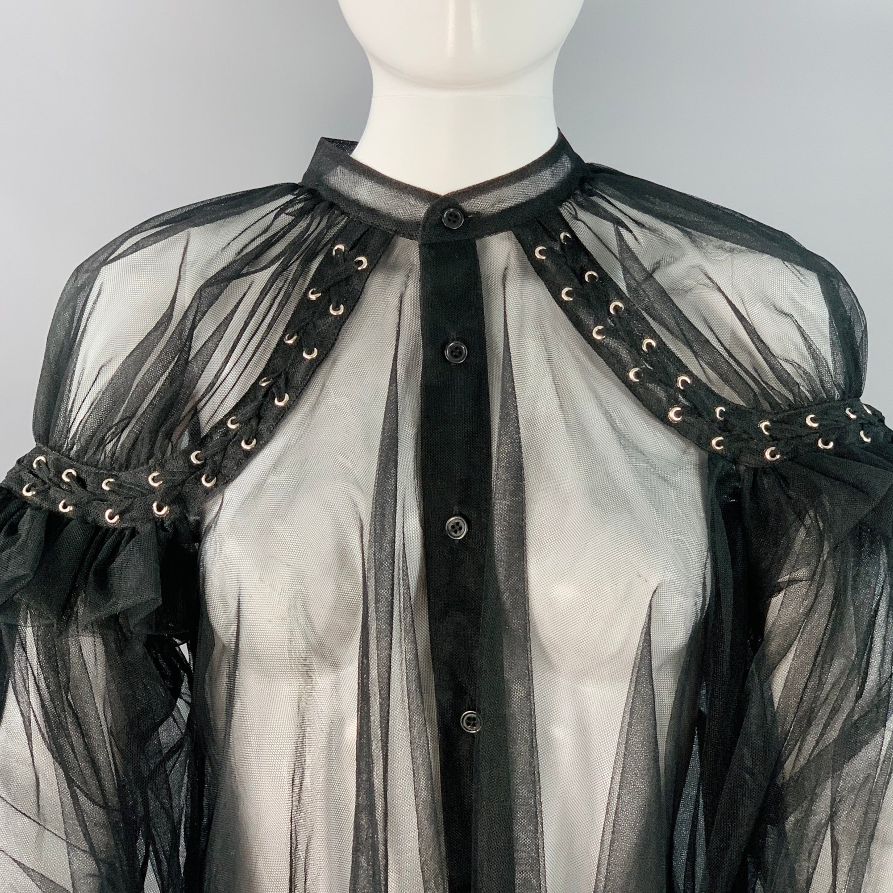 NOIR KEI NINOMIYA blouse in a black polyamide tulle featuring a collarless style, dramatic bell sleeves with shoulder corset lace-up details, and button closure. Made in Japan.