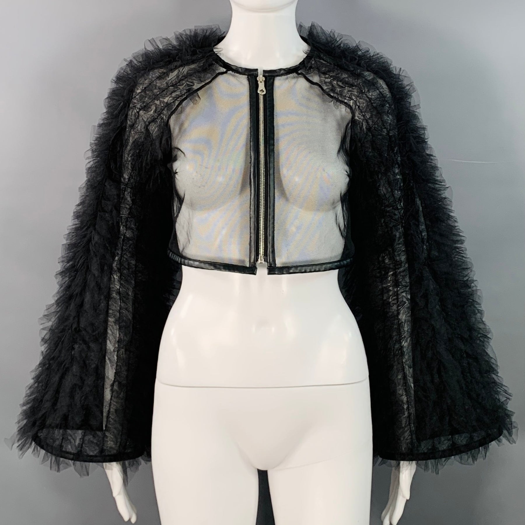 NOIR KEI NINOMIYA jacket in a black polyamide tulle featuring a see through cropped style, statement long ruffled sleeves, and zip up closure. Made in Japan.