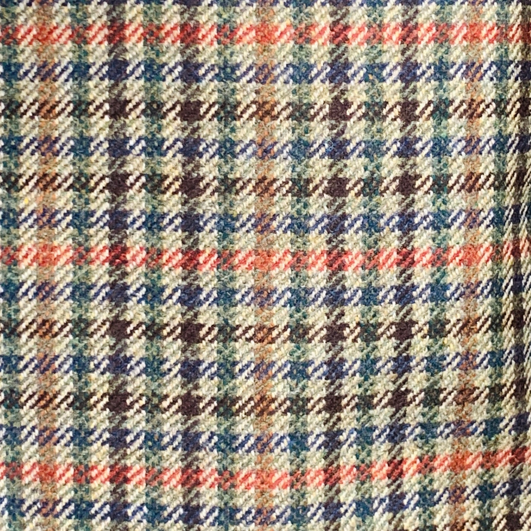 O'CONNELL's sport coat in a tan, red, and blue wool fabric featuring a plaid pattern, notch lapel, single vented back, and three button closure.