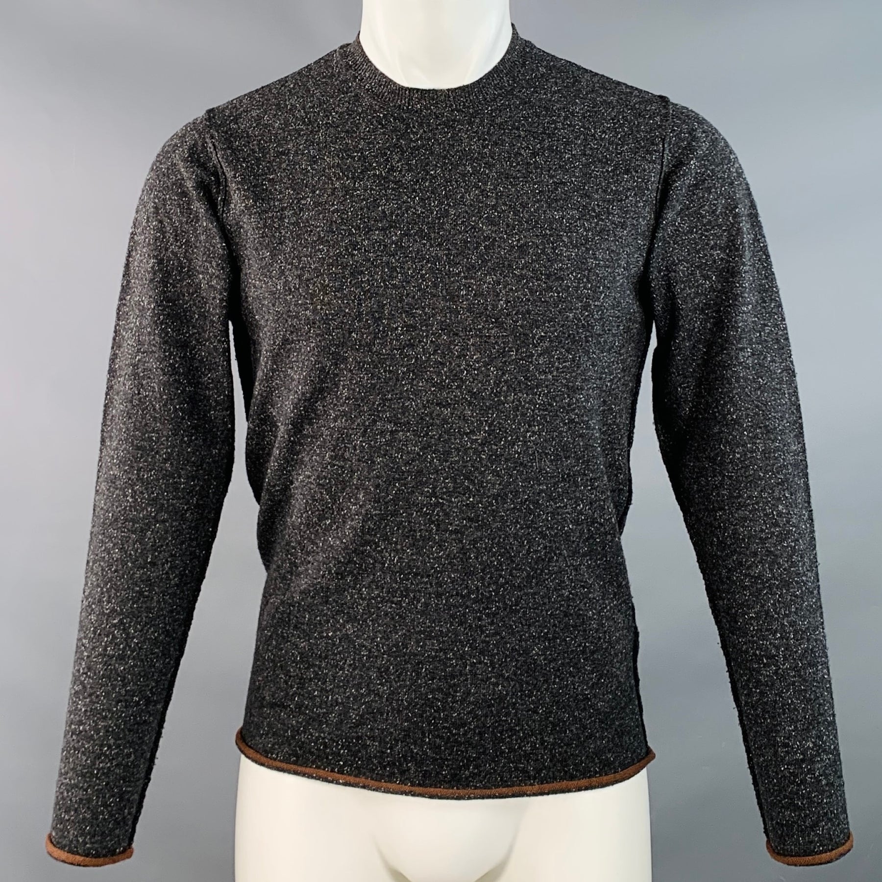 PS by PAUL SMITH pullover in a charcoal grey wool silk blend knit featuring contrasting brown hem and cuffs, and crew neck.