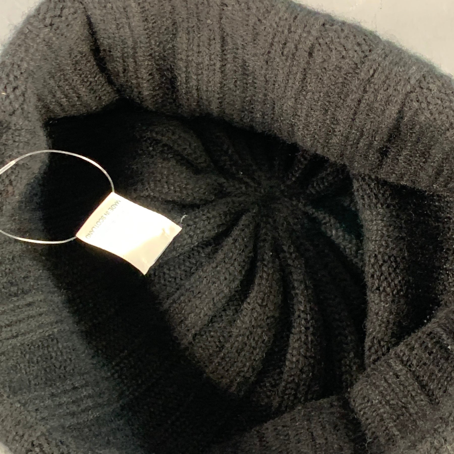 PERMANENT STYLE beanie hat in a blak cashmere knit featuring a rib knit design with foldup brim. Made by JOHNSTONs of ELGIN.