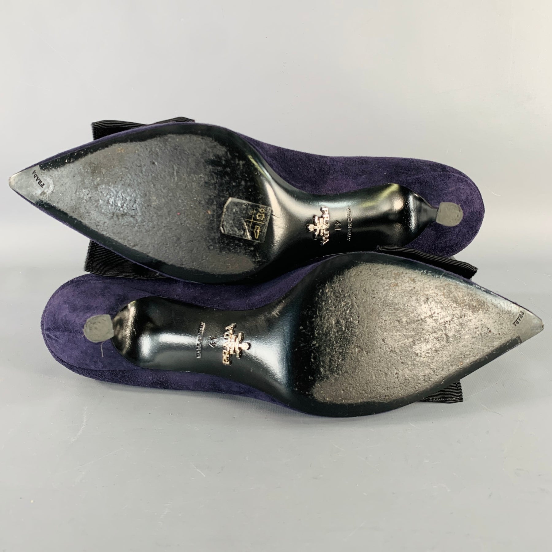 PRADA pumps in a navy suede featuring a black bow, kitten heel, and pointed toe.