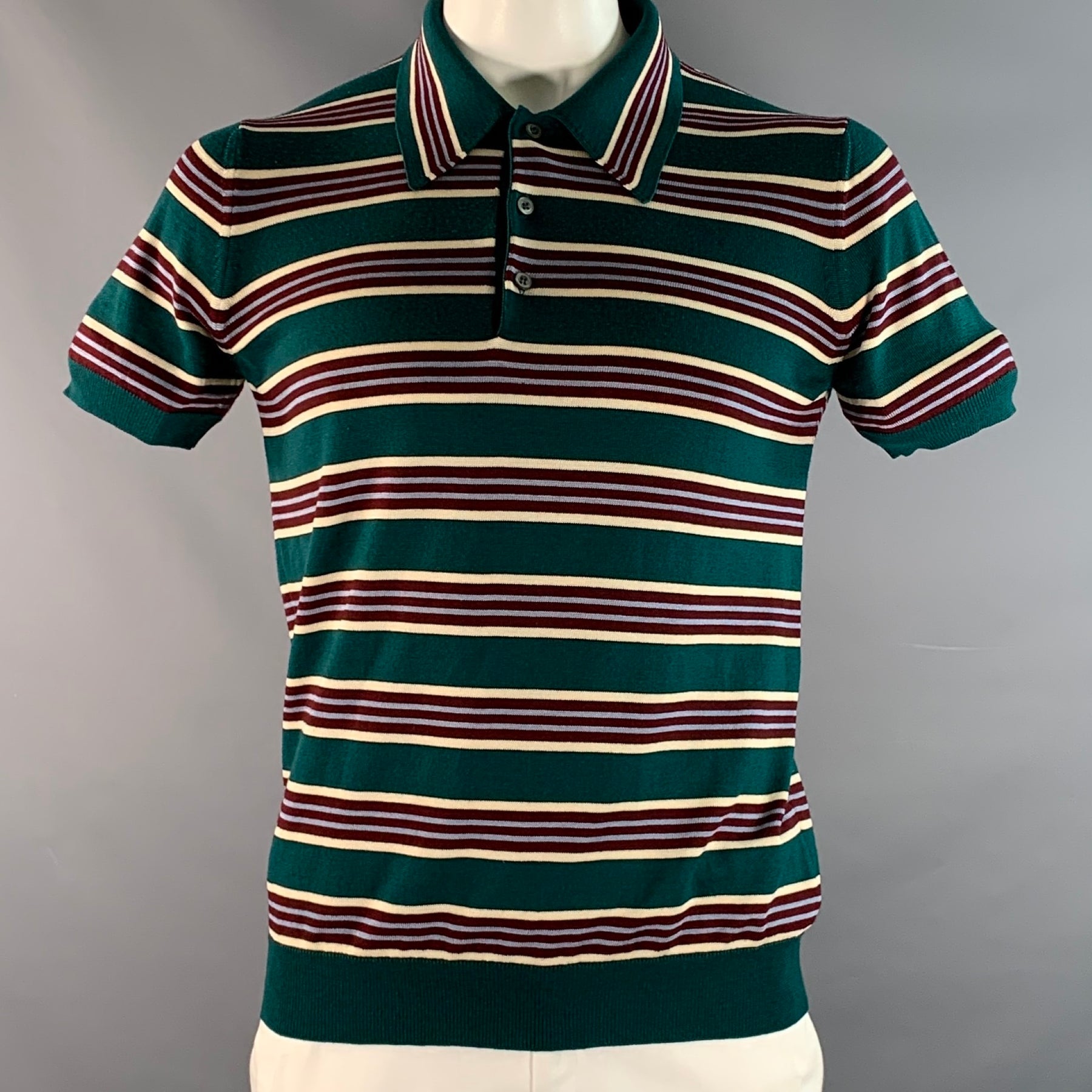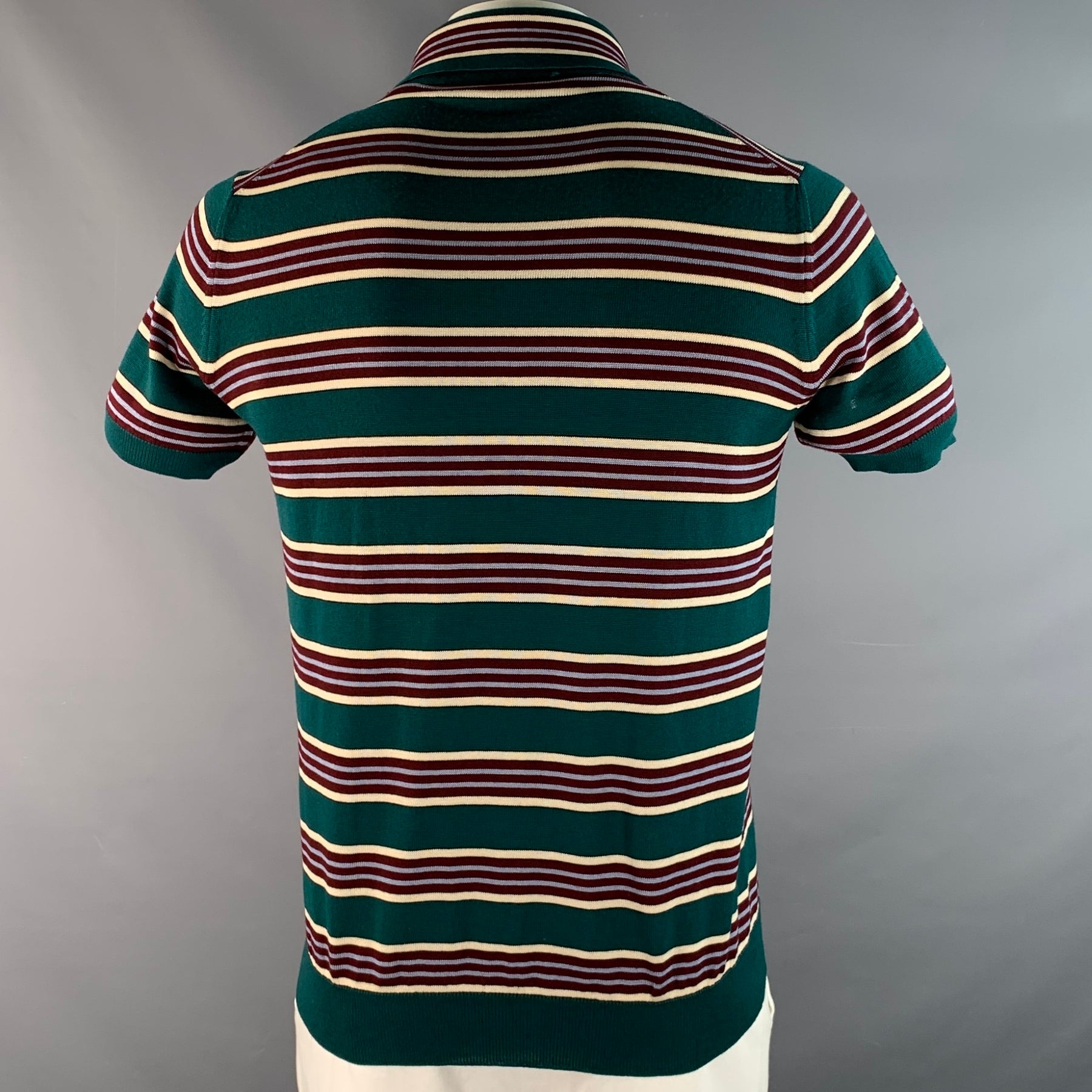 PRADA Size L Green Burgundy & White Stripe Virgin Wool / Silk Half Placket Polo