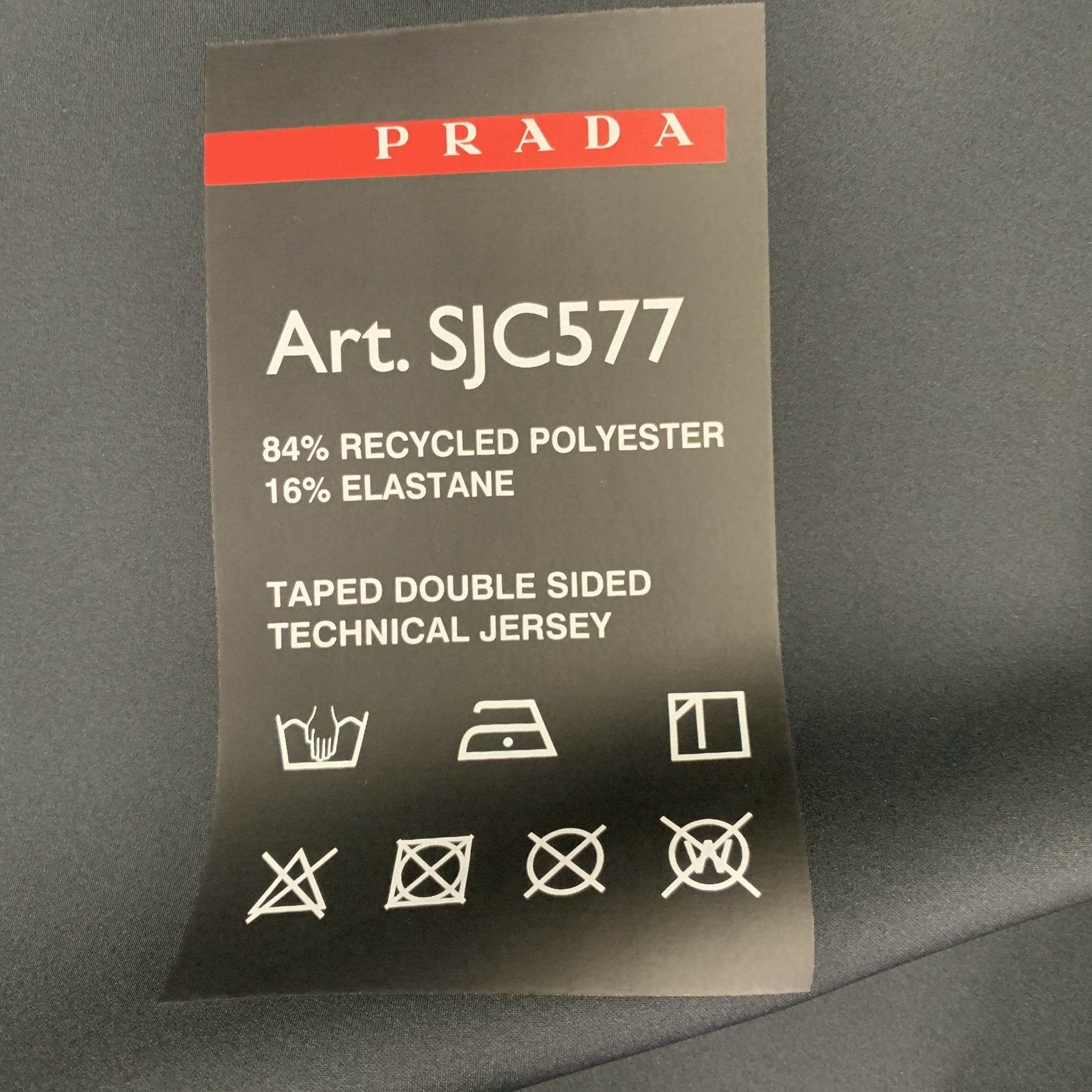 PRADA jacket in a black double sided polyester stretch blend jersey featuring red rubber logo, zip pockets, and zip up closure.