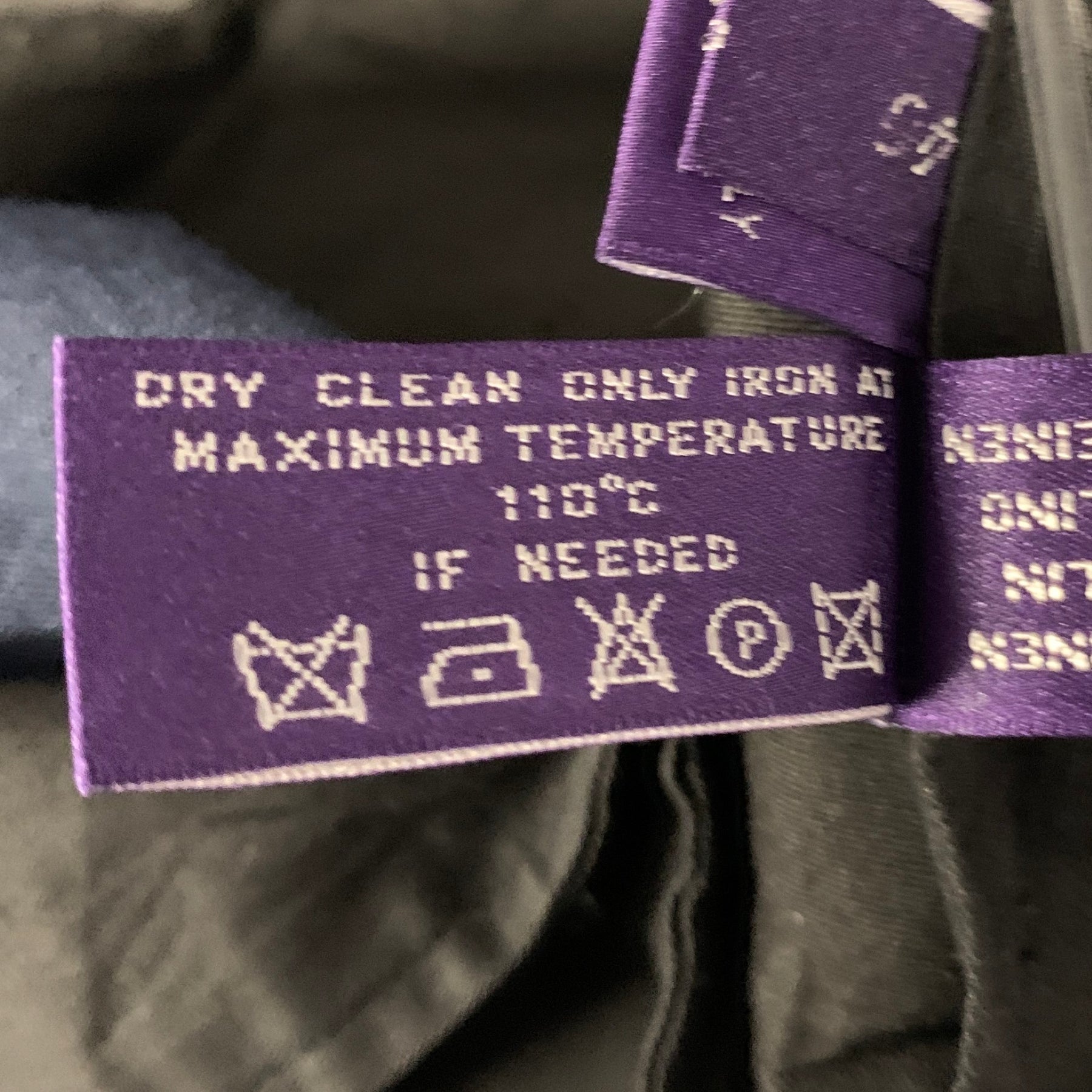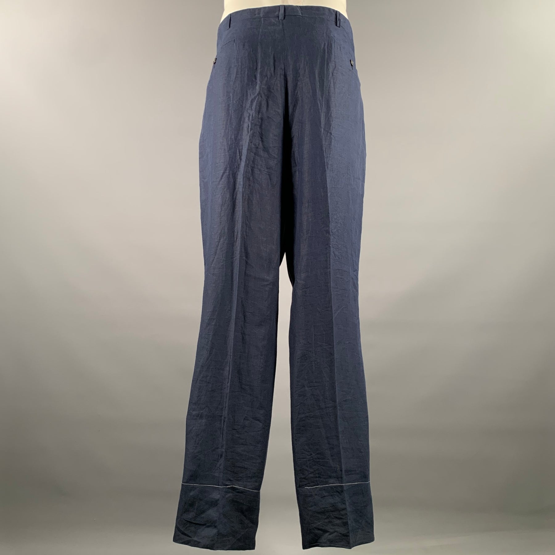 Ralph Lauren Purple Label trousers, meticulously crafted in Italy, feature a sophisticated navy linen fabric with distinctive white contrast stitching. The pleated, wide-leg silhouette and generous 36-inch inseam offer a refined, airy aesthetic perfect for elevated casual summer style.