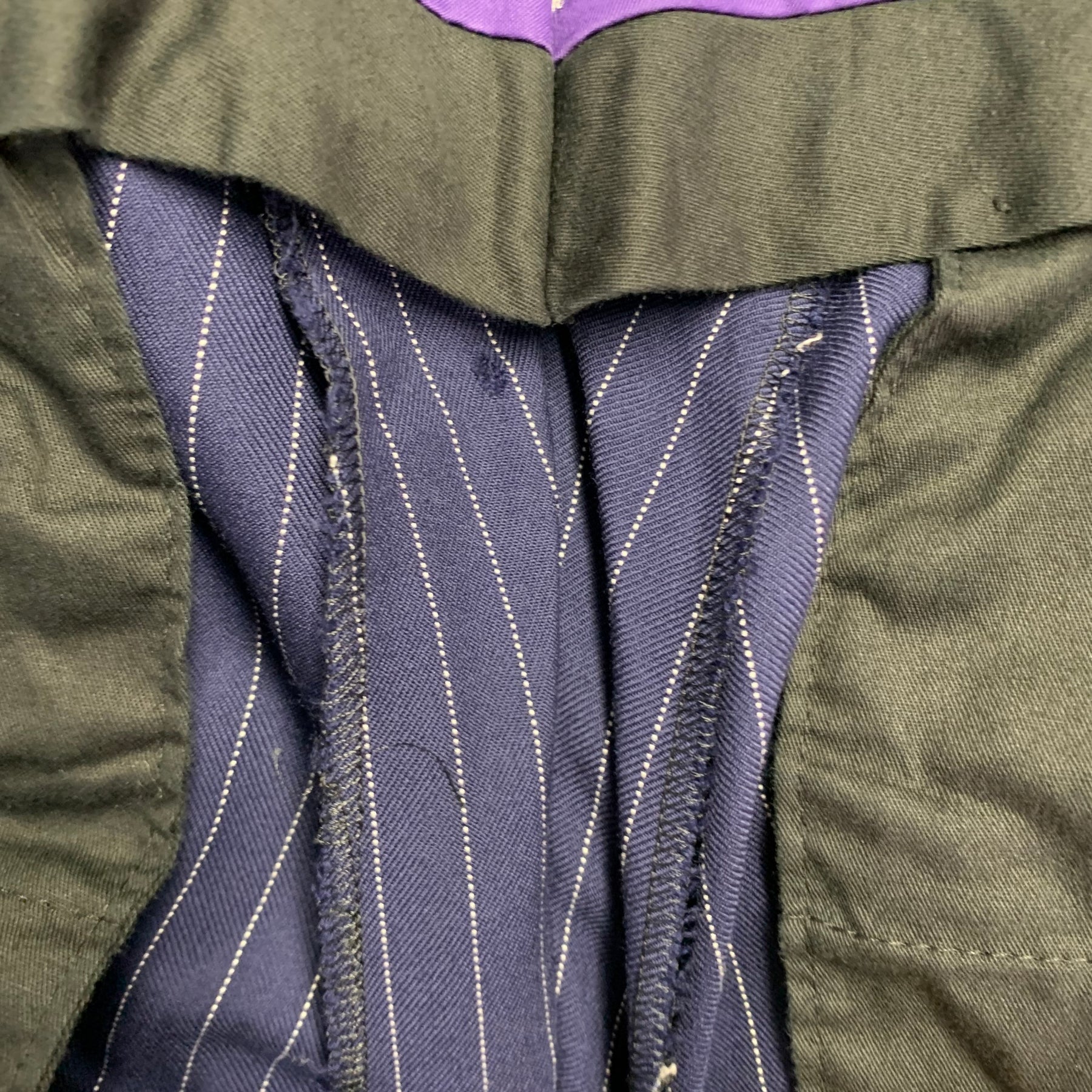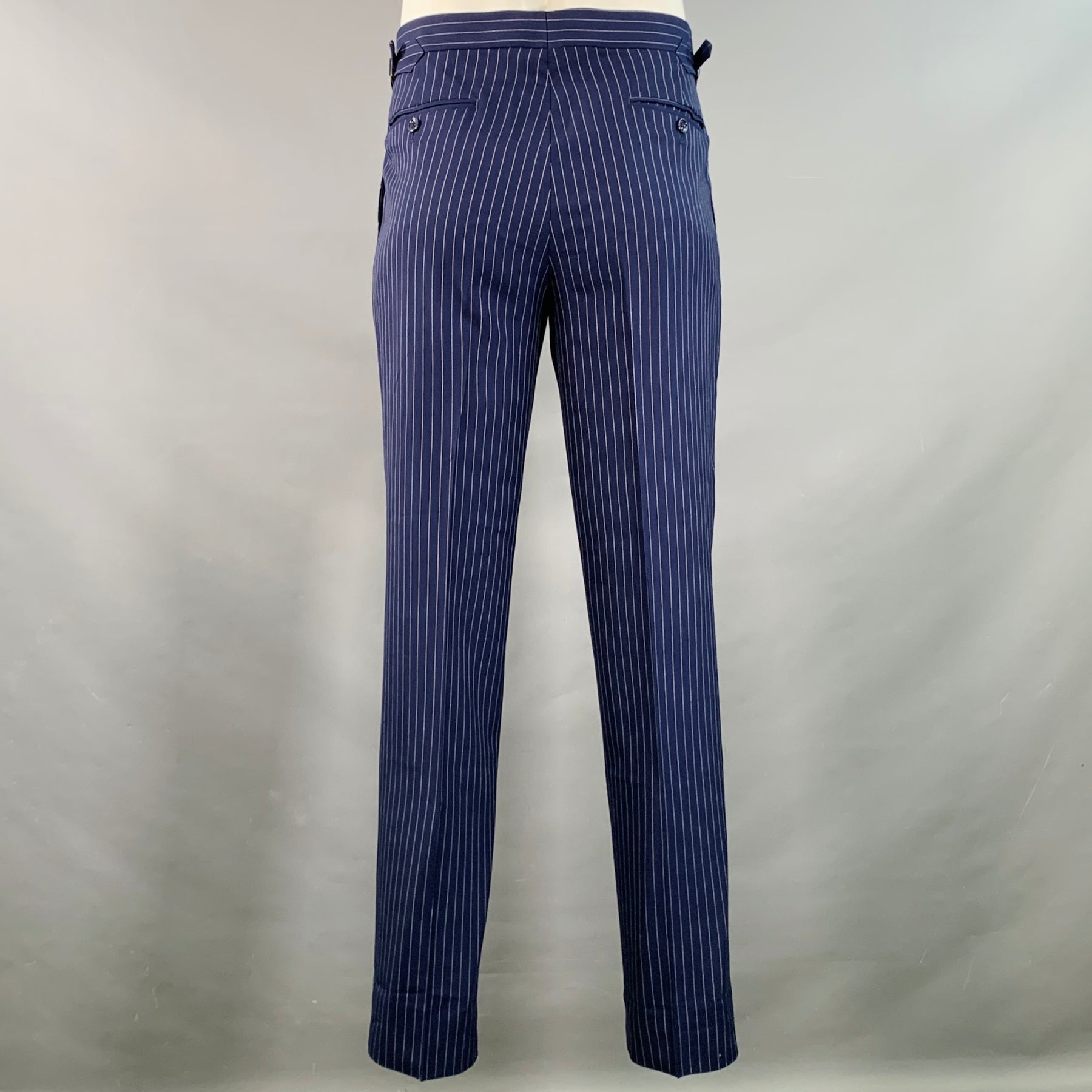RALPH LAUREN PURPLE LABEL suit in a navy and white pinstripe wool with a full liner and includes a single breasted, double button sport coat with a notch lapel and matching flat front trousers. Made in Italy.