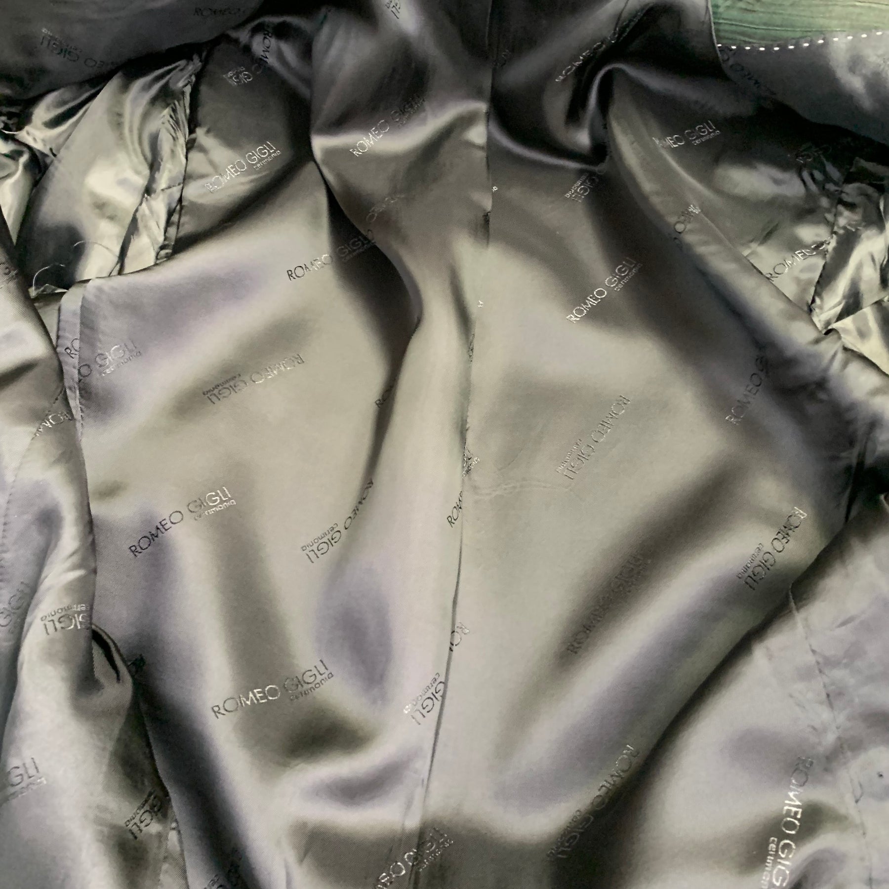 ROMEO GIGLI sport coat in a black virgin wool twill fabric featuring a contrasting green textured notch lapel, double vented back, and double button closure.